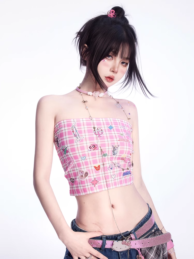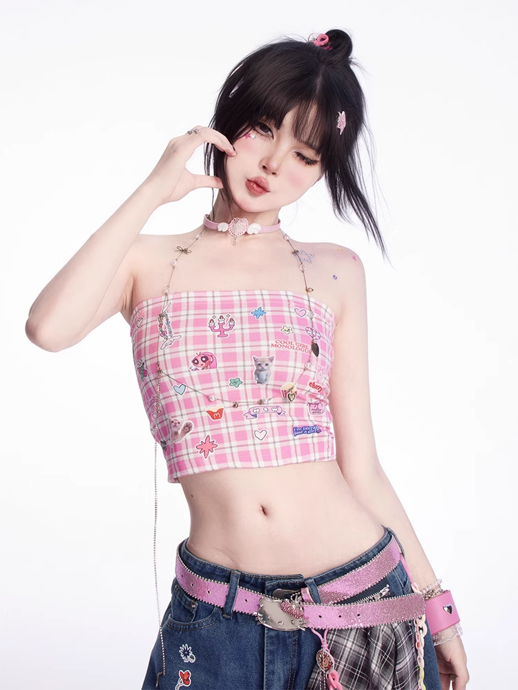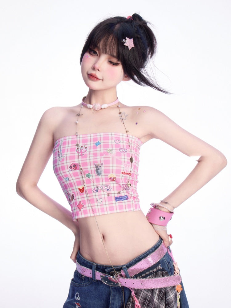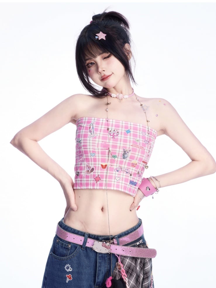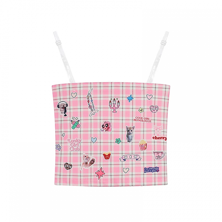 かわいい子猫のステッカープリントのピンクのチェック柄クロップド丈ストラップレストップス