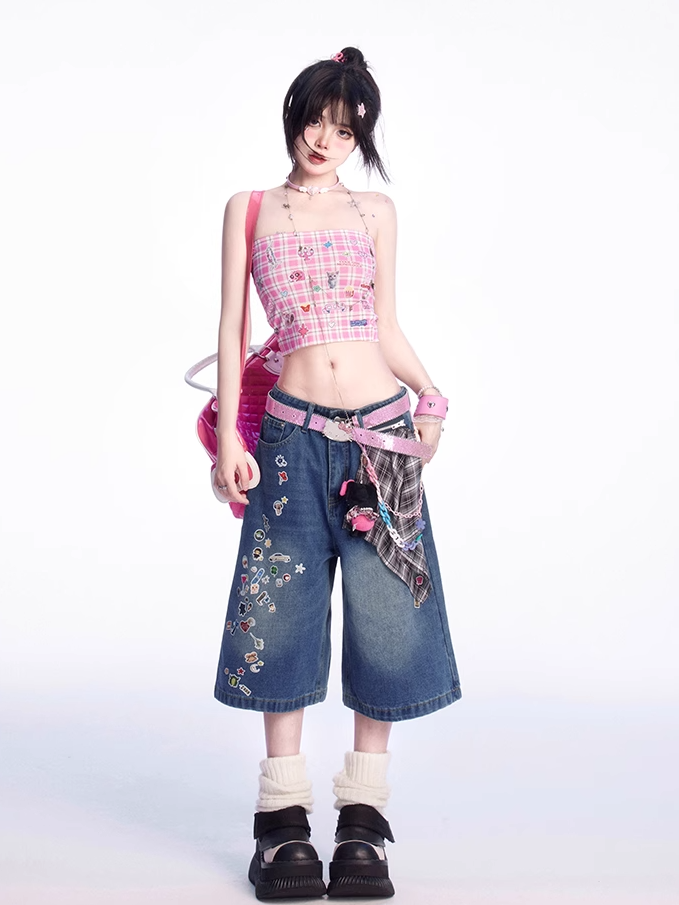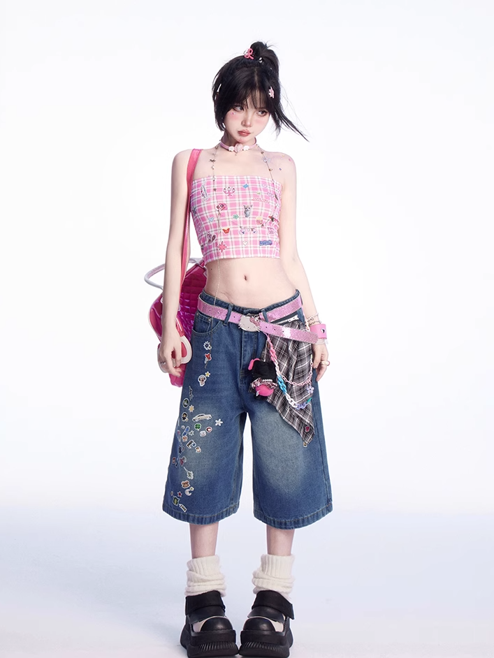 ストラップレストッププリントのかわいい子猫のステッカー付きピンクチェック柄クロップド丈