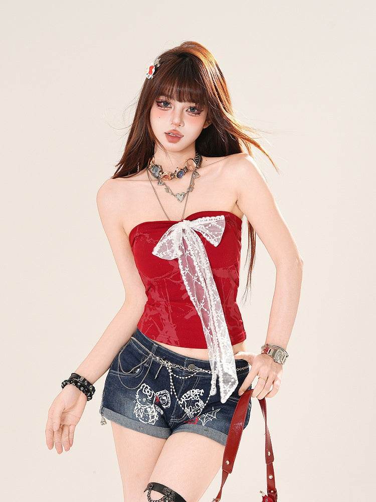 ストラップレストップ レッド/ブラック レース ボウフロント グラマラス