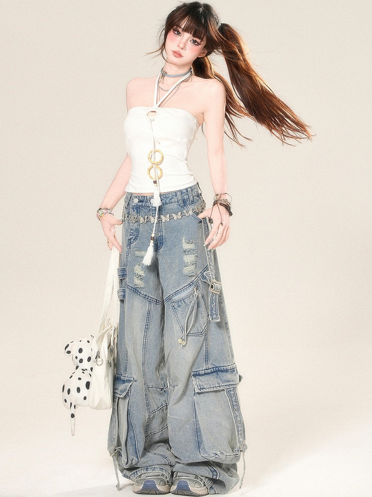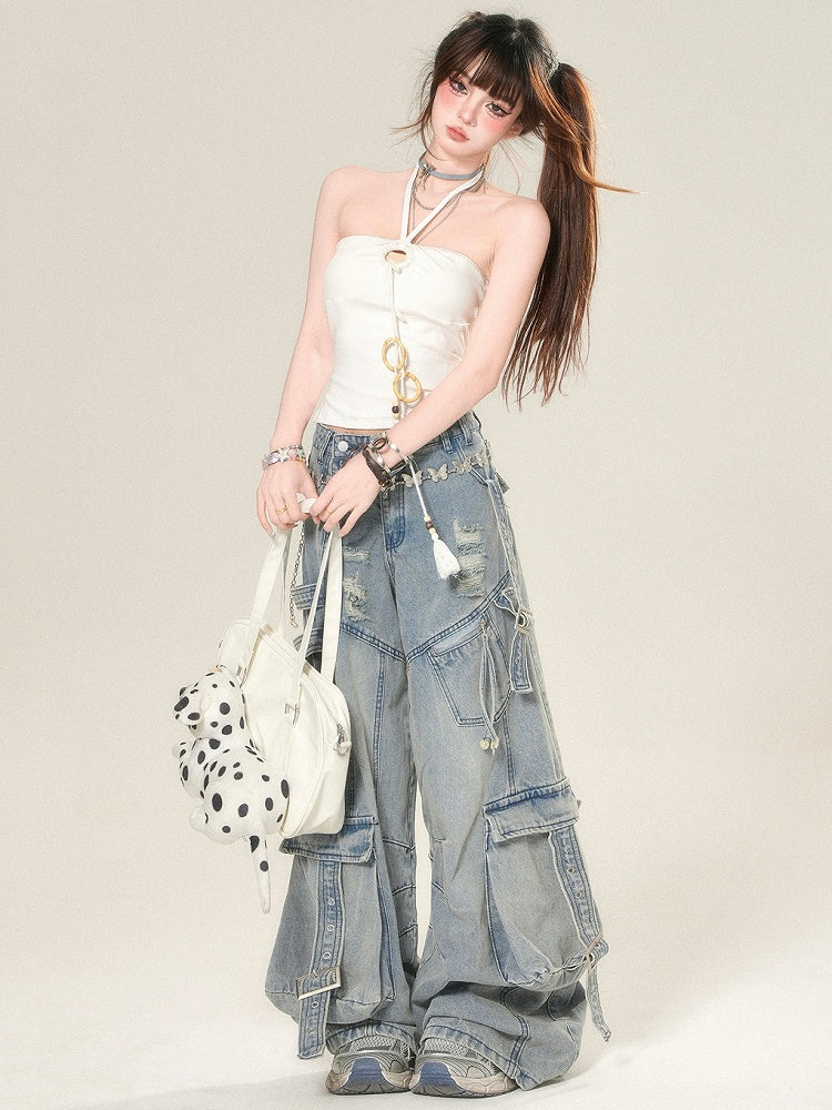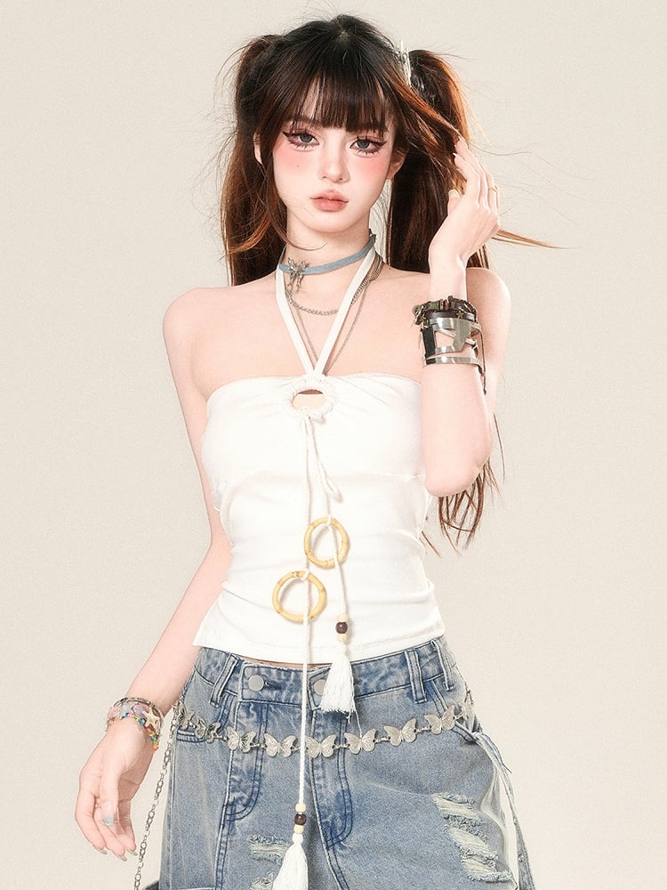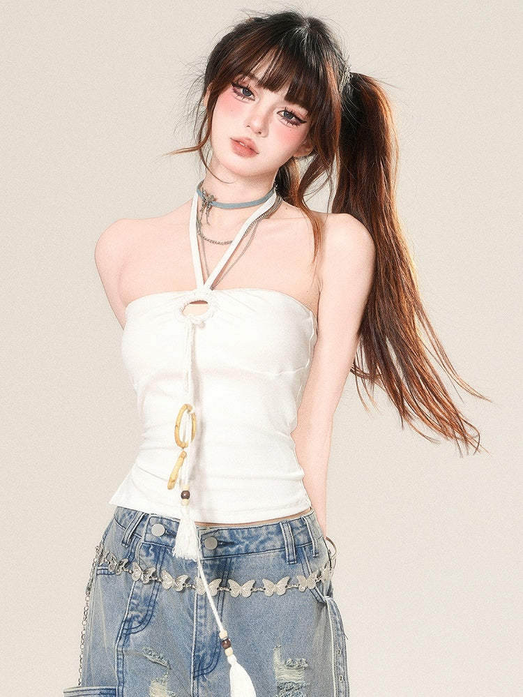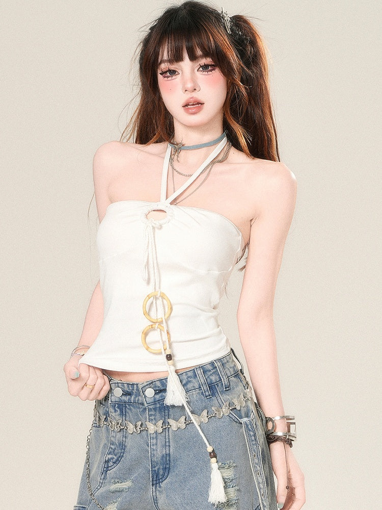 ホワイトのグラマラスタッセルストラップホルターネックトップ