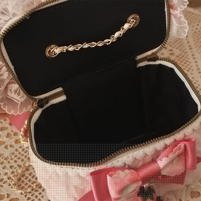 ストロベリービーズチャームと蝶結びディテールのレーストリムバッグで、さりげなく装いに魅力をプラス。繊細なレーストリムとキュートな蝶結びのディテールが、どんなシーンにもぴったりのアクセサリーです。必需品をスタイリッシュに持ち歩き、この素敵なバッグで差をつけましょう!
