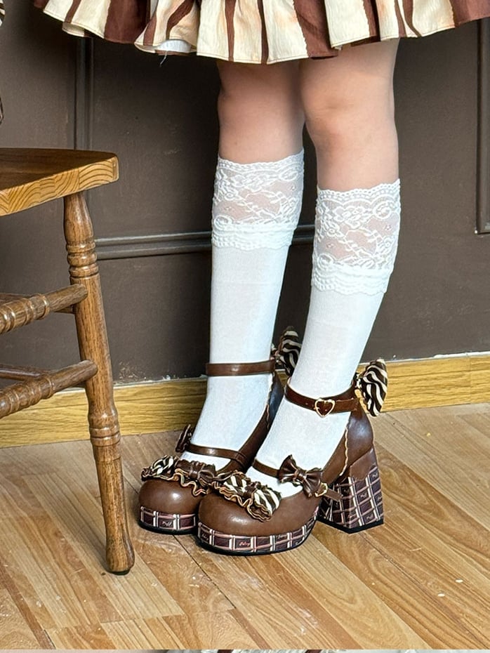 ライトブラウンのストライプ柄、蝶結びのディテール、ハートバックル、チョコレート色のプラットフォームハイブロックヒール、メリージェーン