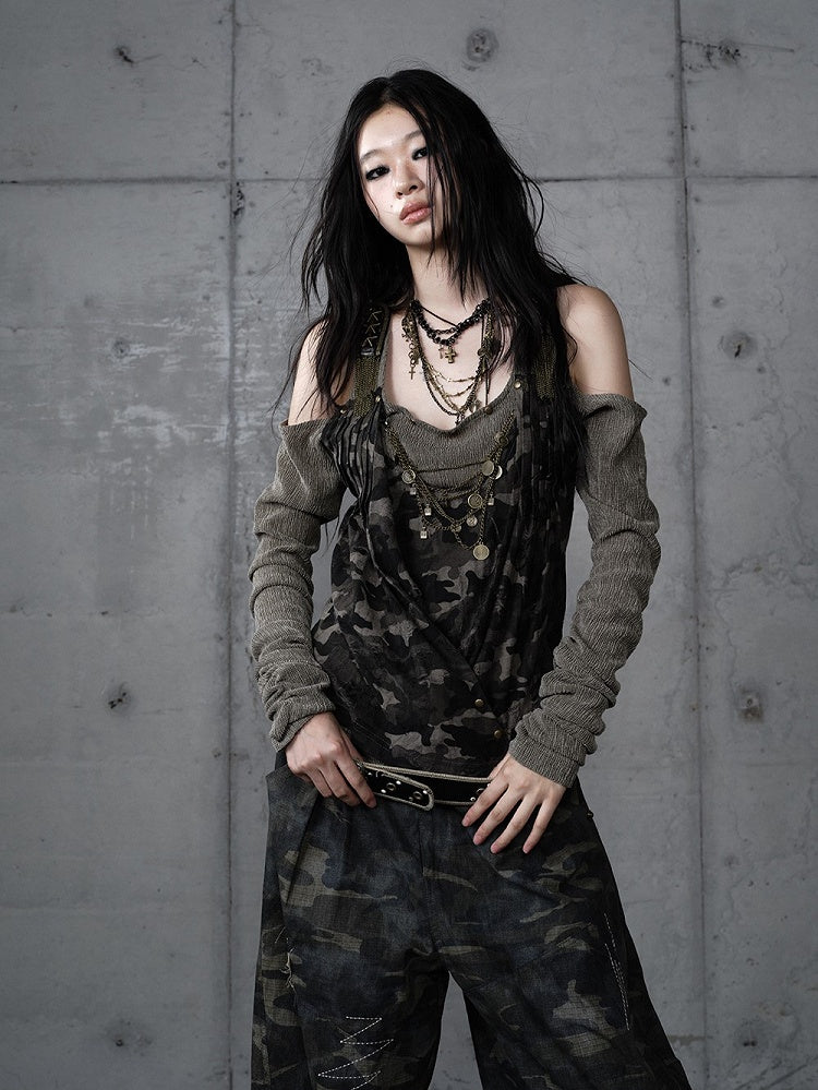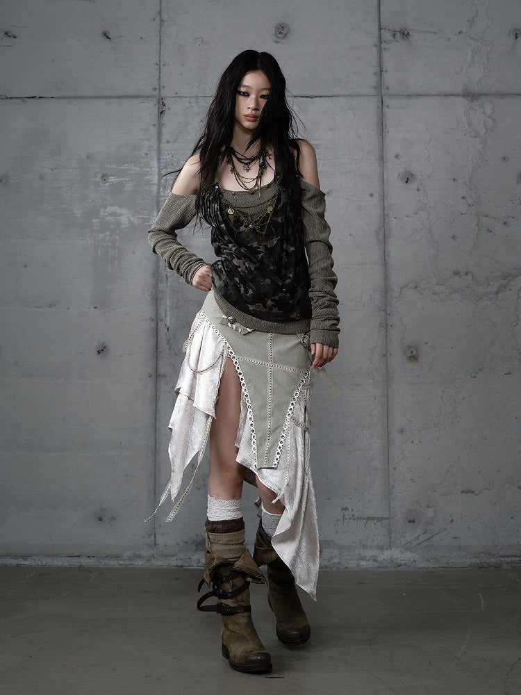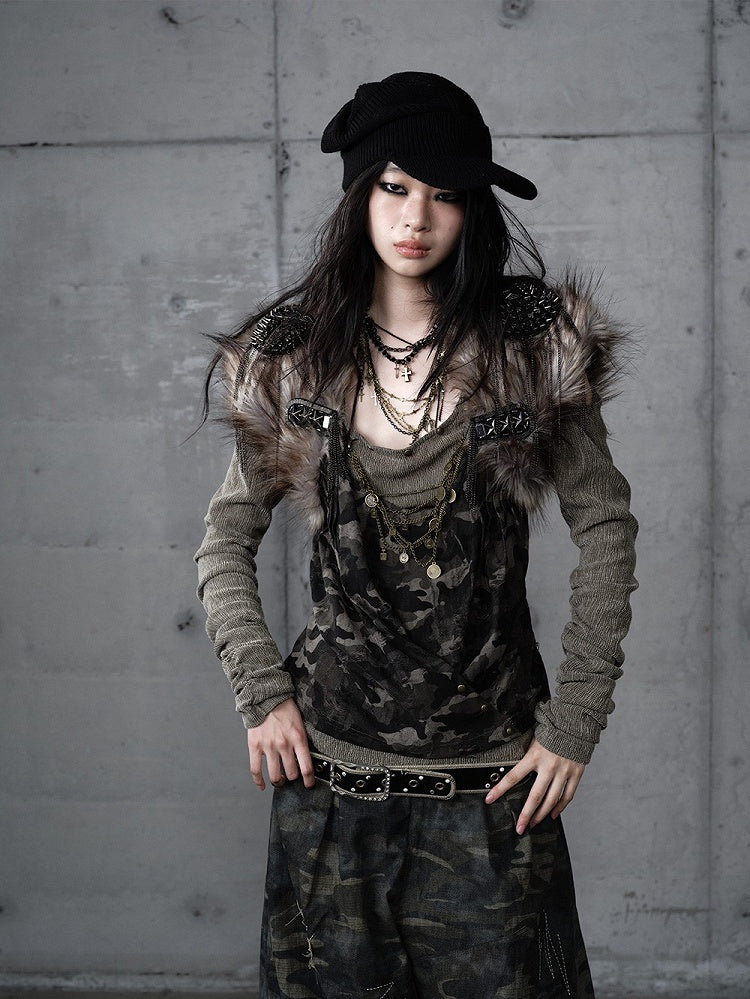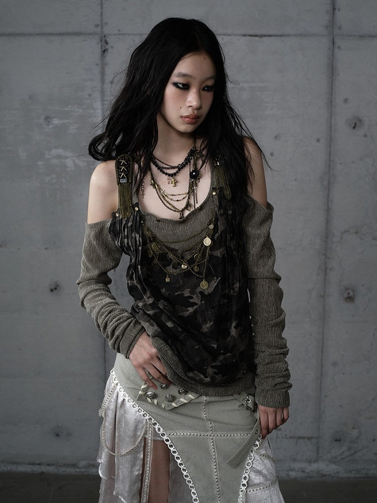 Studded Design Camo Accents Green Vintage Knit Cold-Shoulder Punk with Top