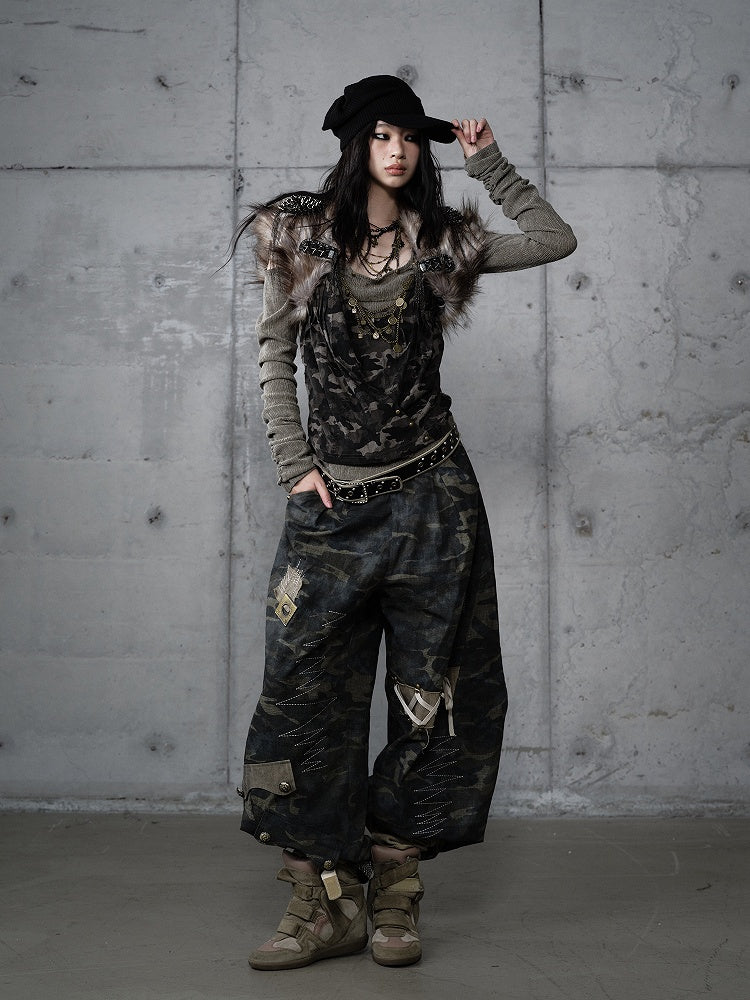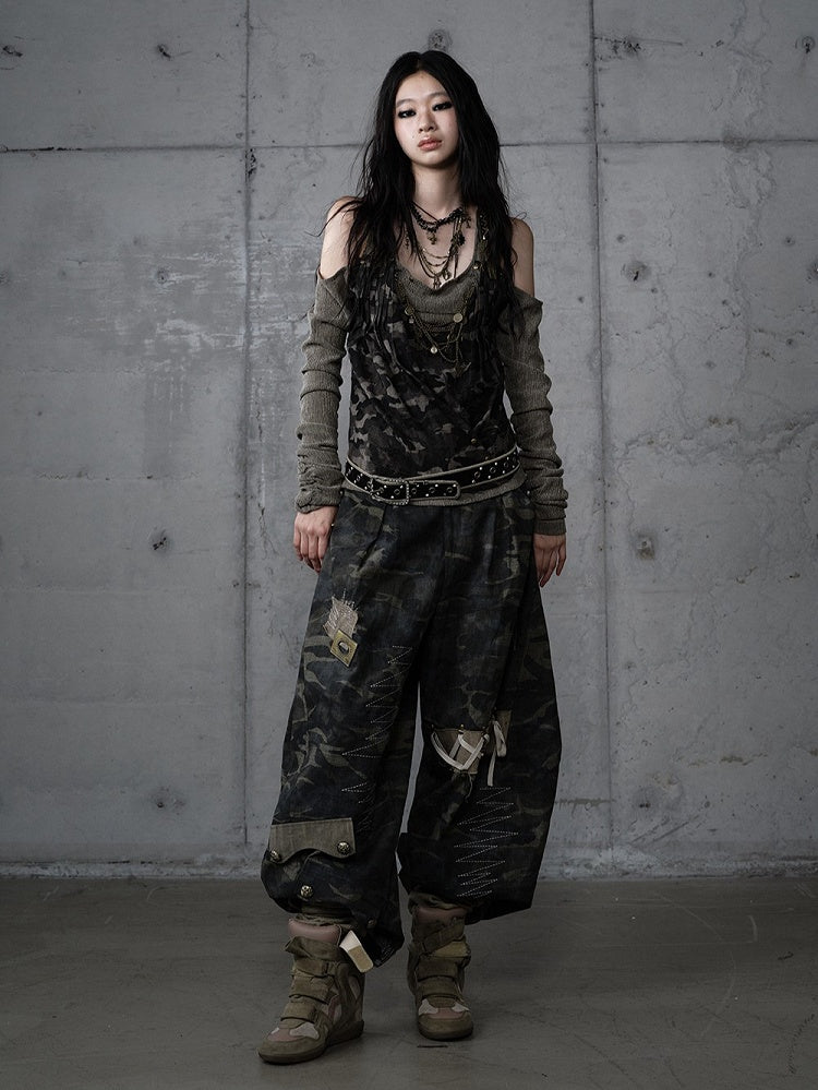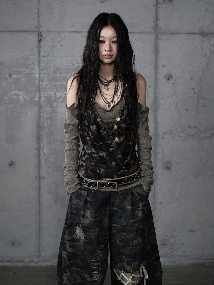 Vintage Green Camo Punk Knit Top with Studded Accents & Cold-Shoulder Design
