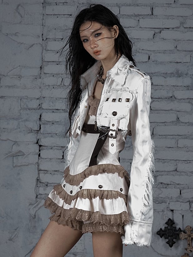 ホワイトウェイストランドパンクスタッズ&バックル装飾クロップドジャケット