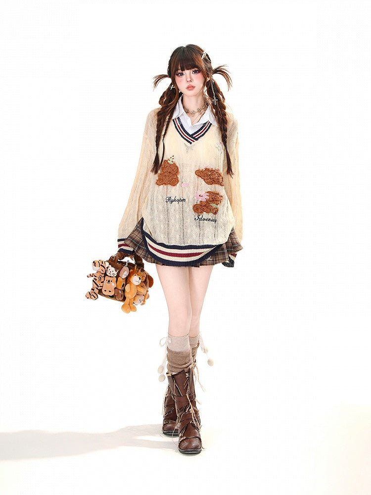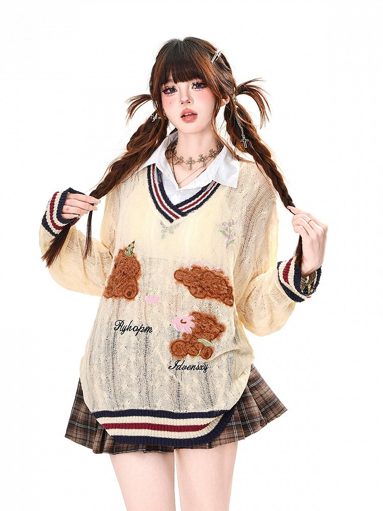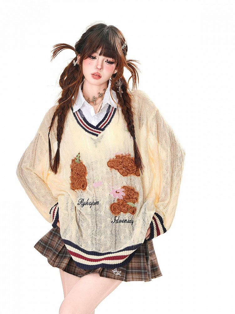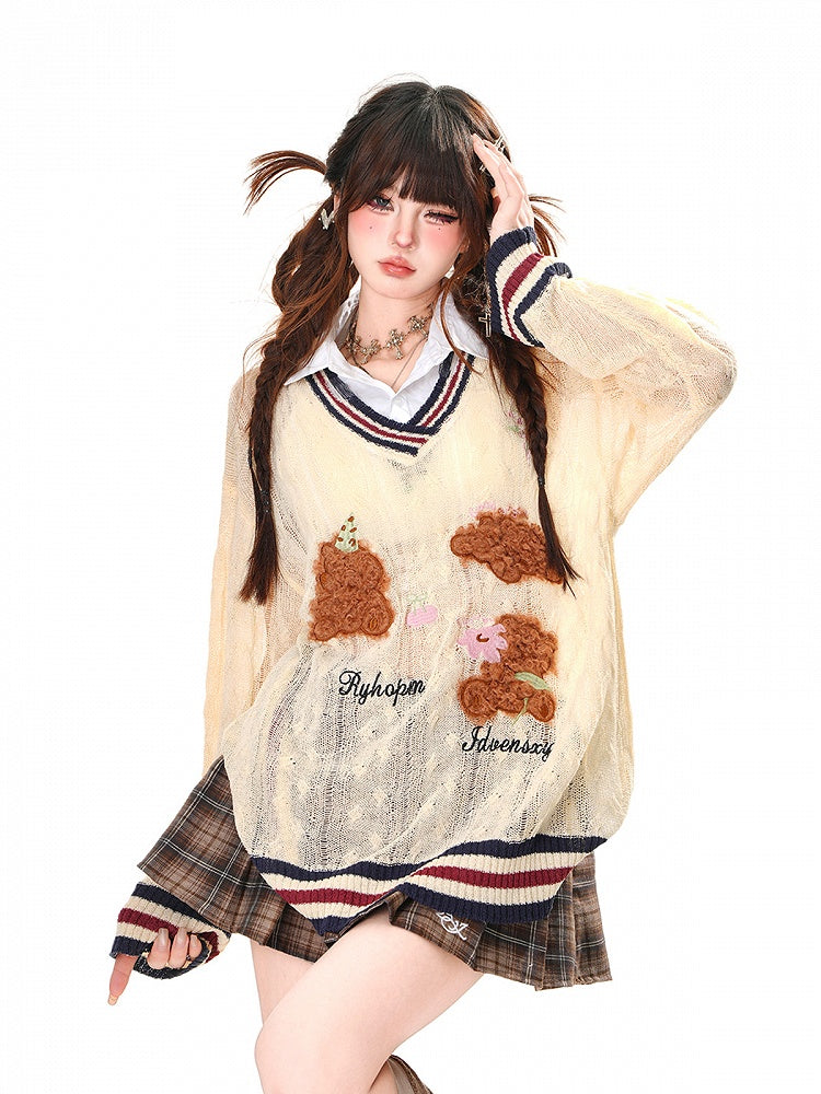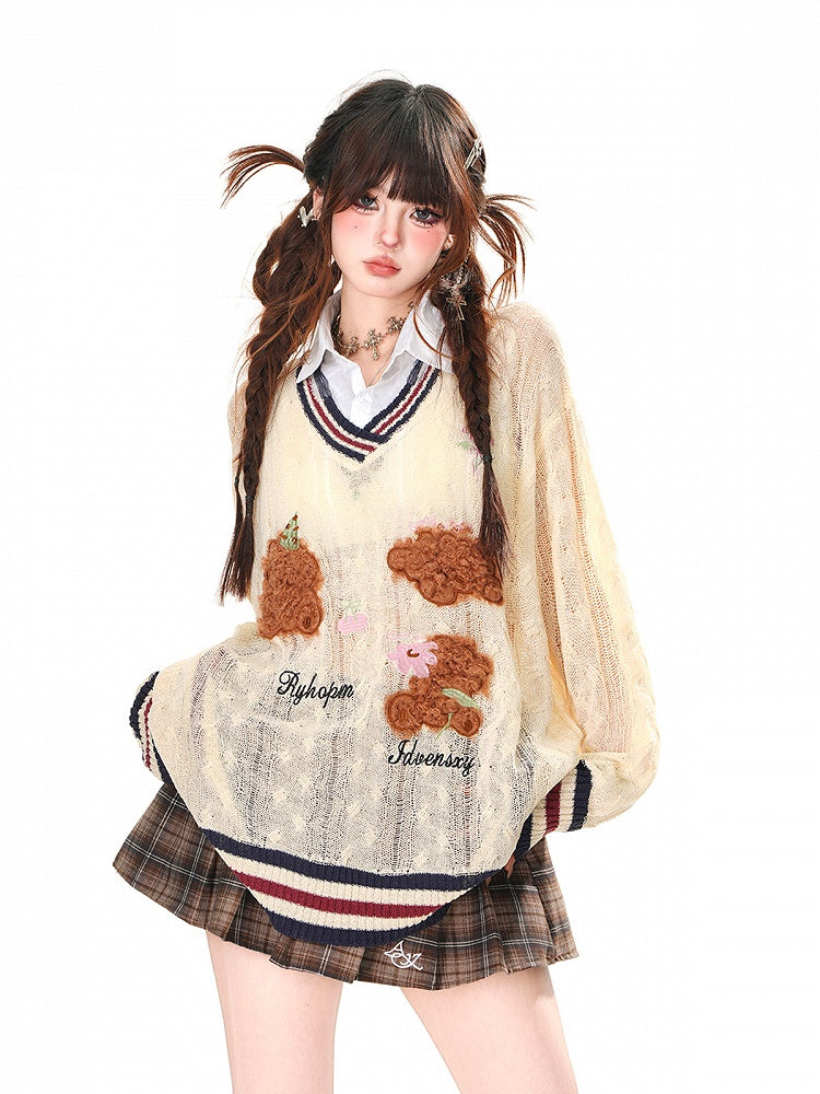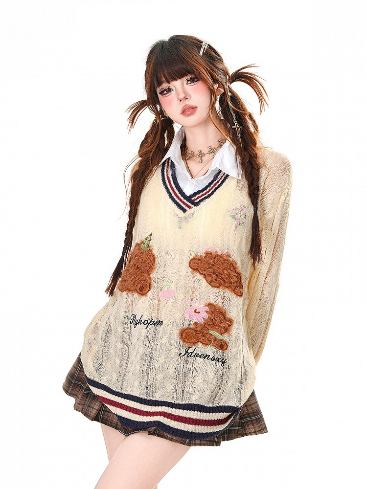 アプリコットプレッピースタイルベア柄日焼け止めホローアウトシャツフェイクツーピース