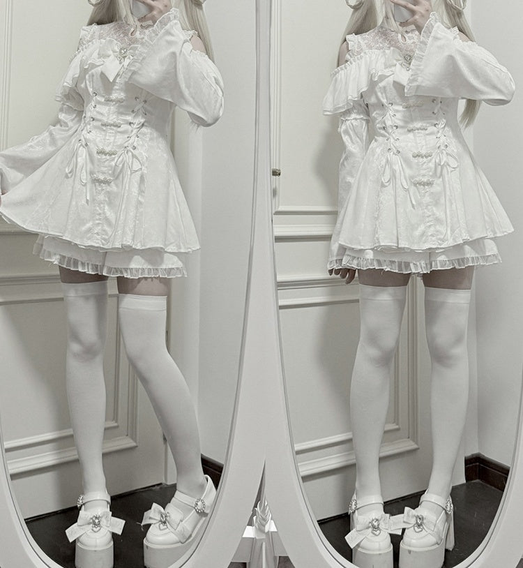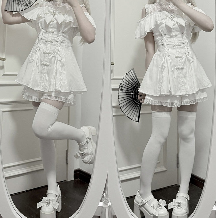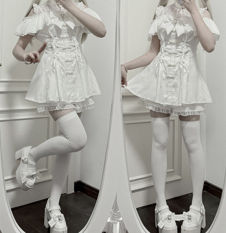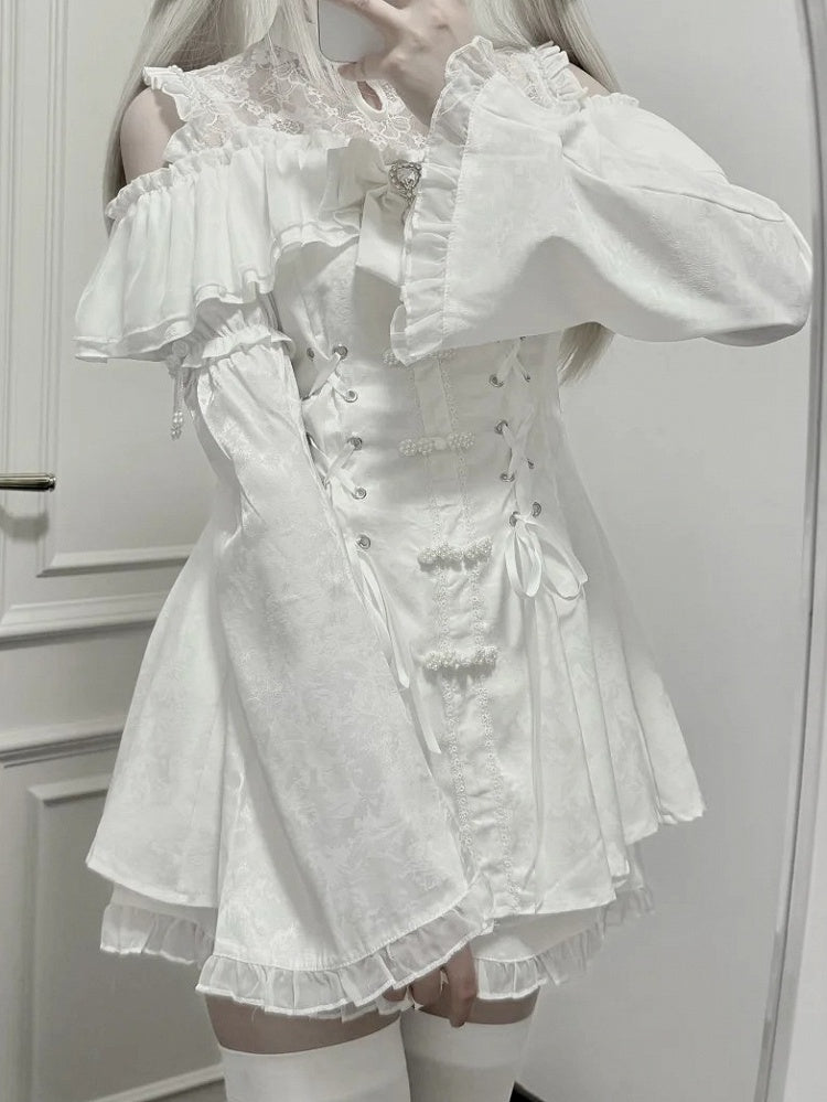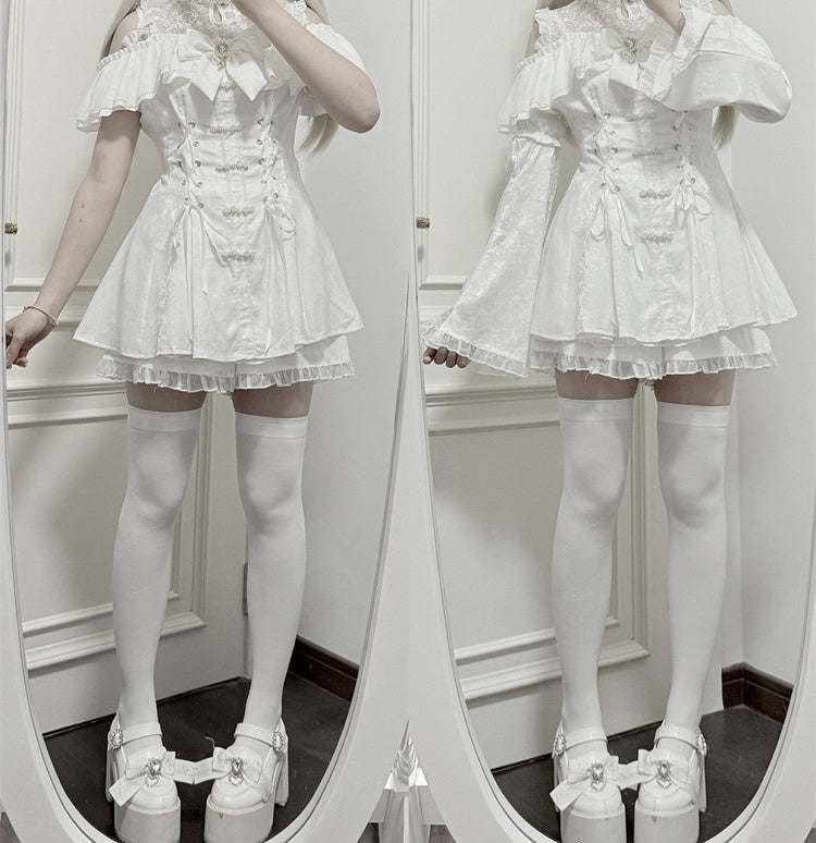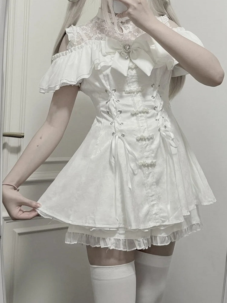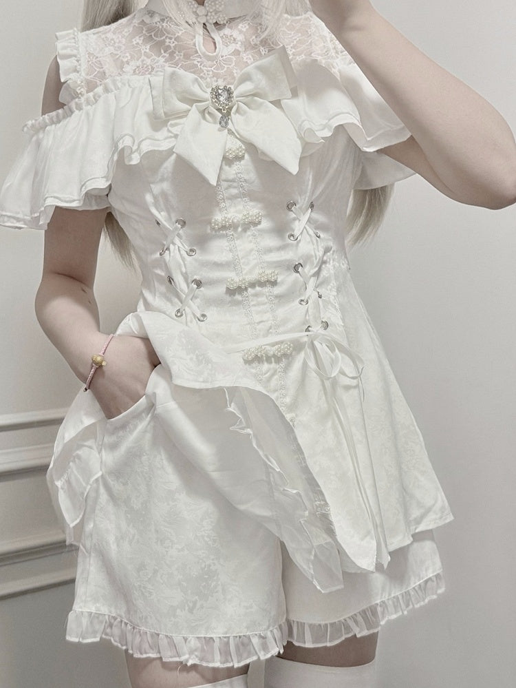 ホワイトチャイナドレス風ジライケイセット - イリュージョンネックラインミニドレス + ショートパンツ + 蝶ネクタイ + ベルスリーブ