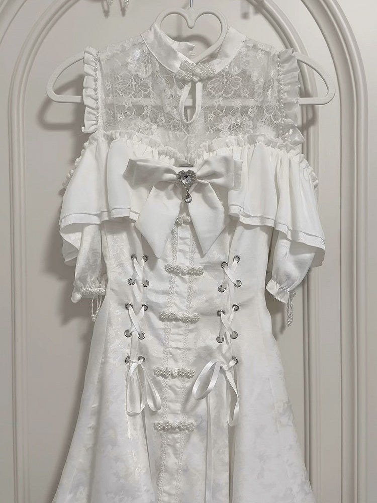 スタイルイリュージョン ボウタイ ミニドレスセット - ケイ チャイナドレス ホワイト + ショーツ ジライネックライン + ベルスリーブ