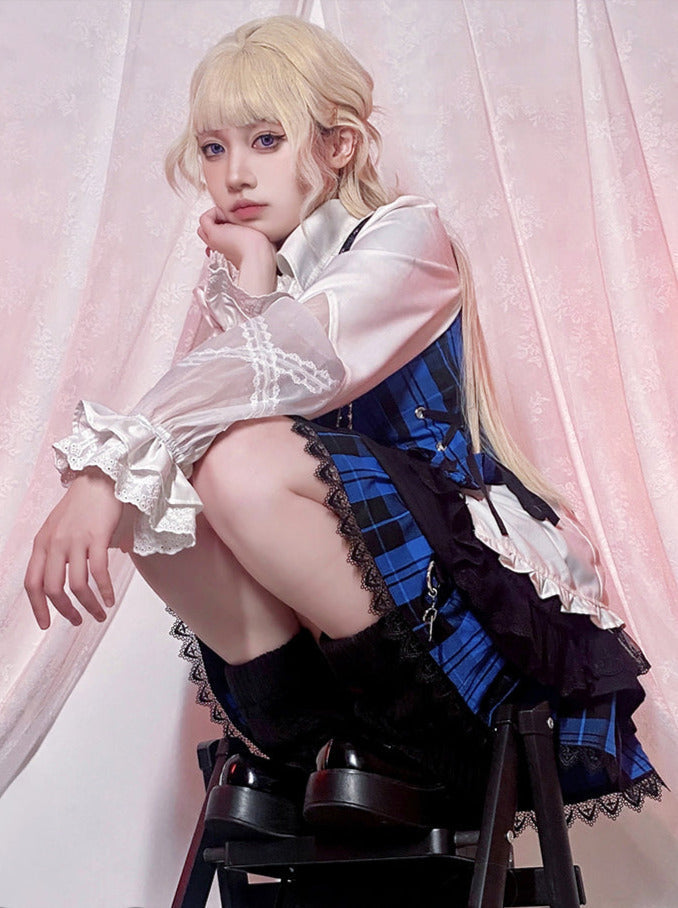 青と白のオールドスクールロリータファッションドレス 蝶結びディテール JSK セット