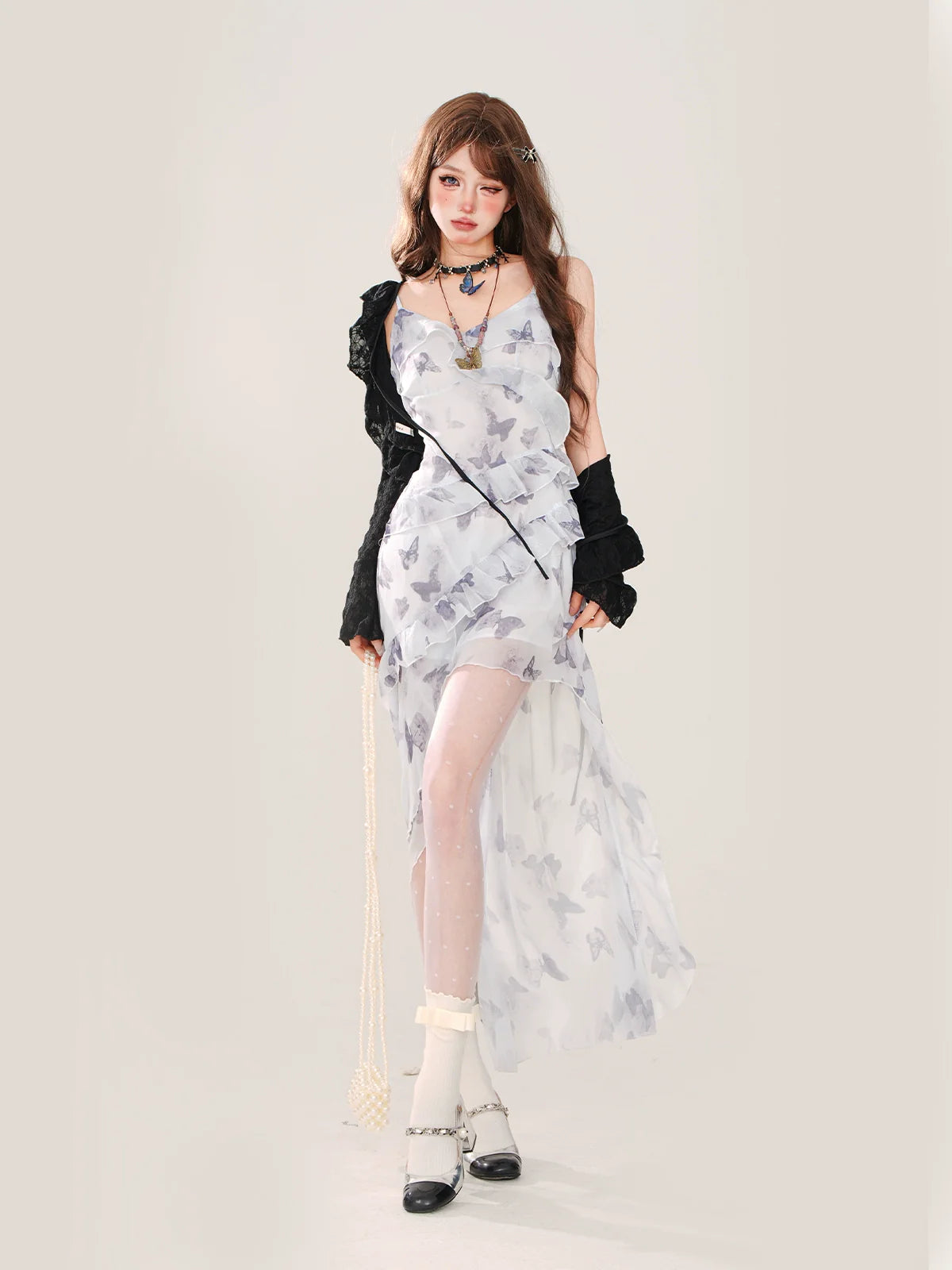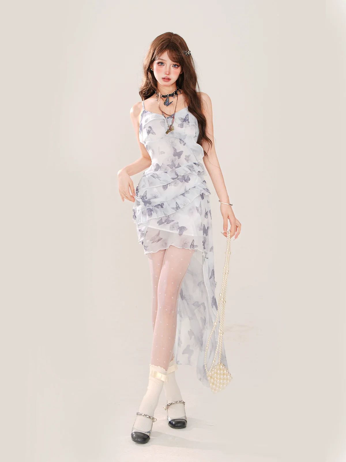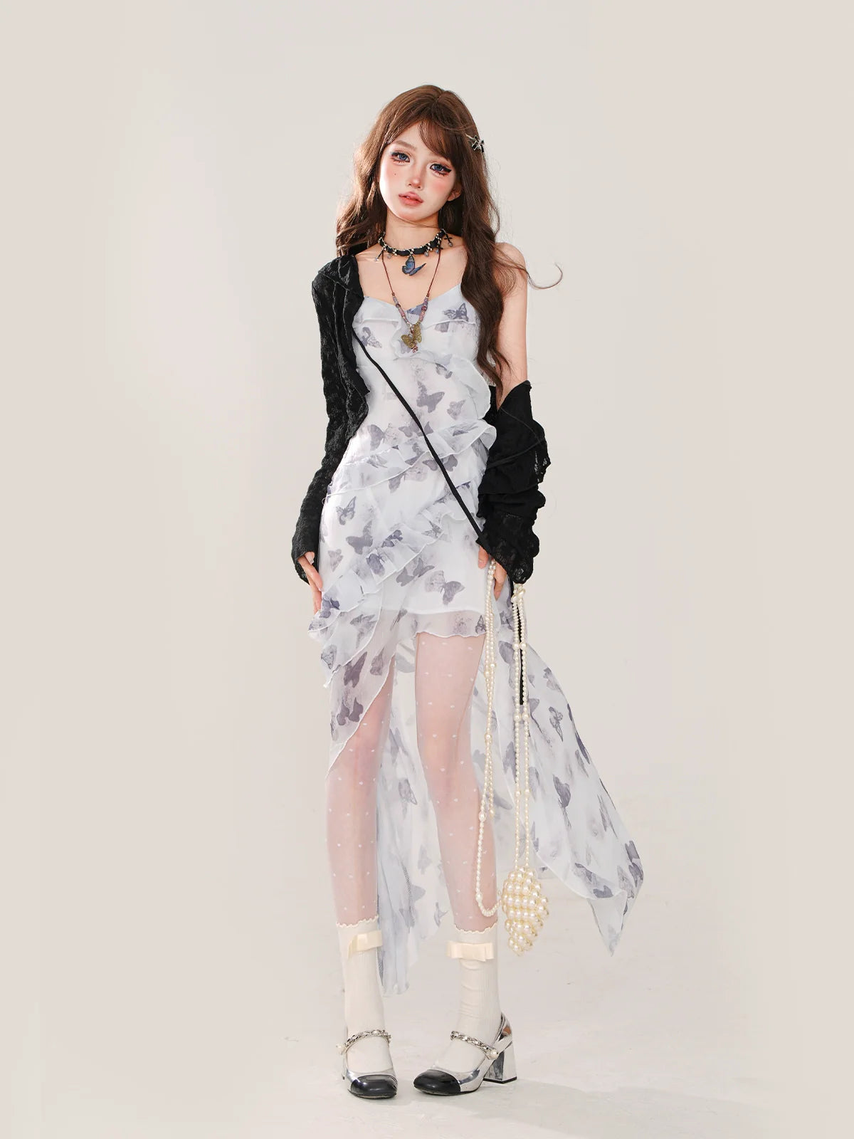 夏のシフォンドレス バタフライカーディガン + アシンメトリー