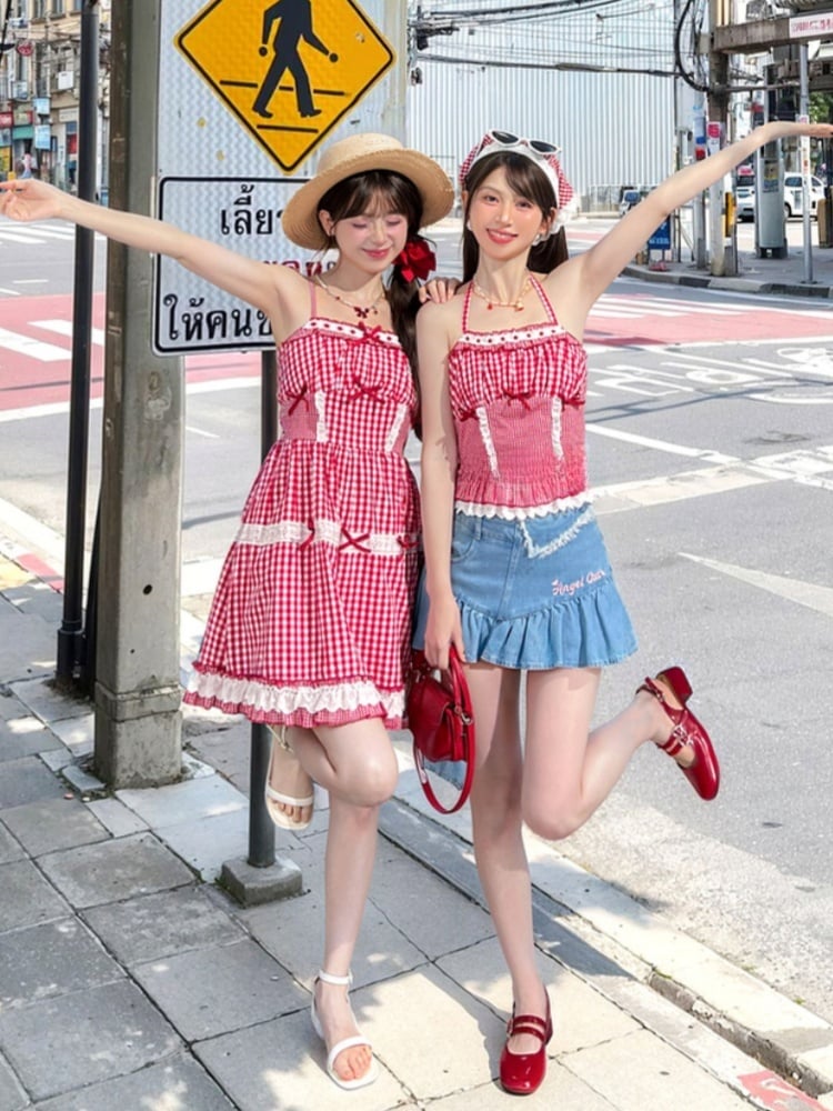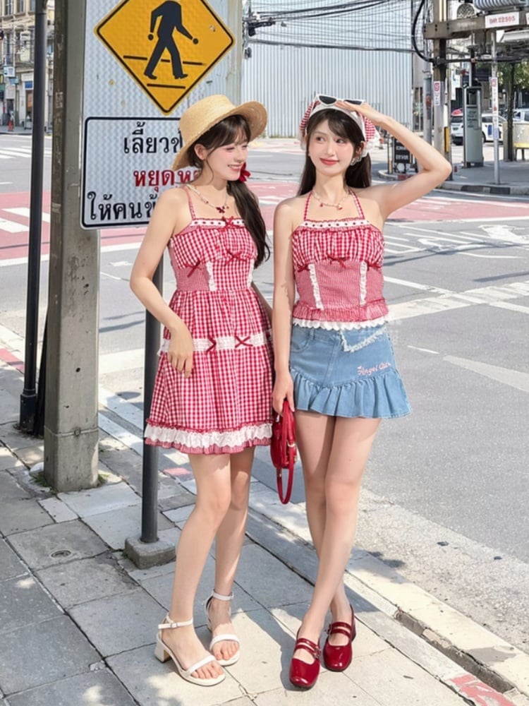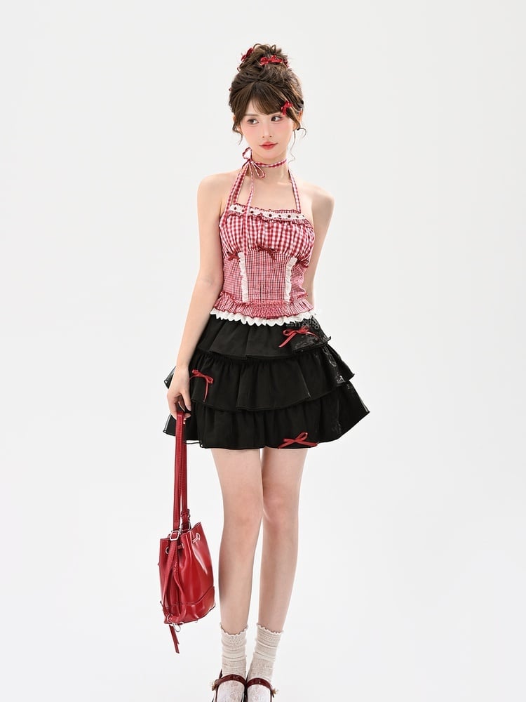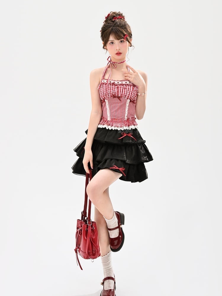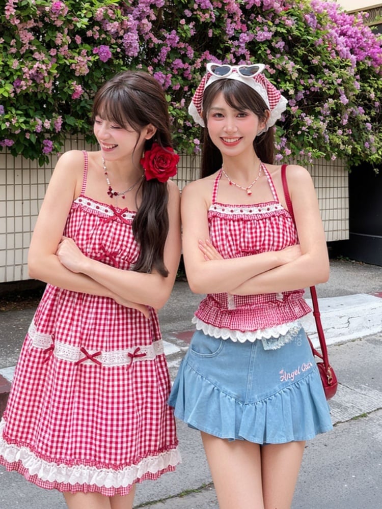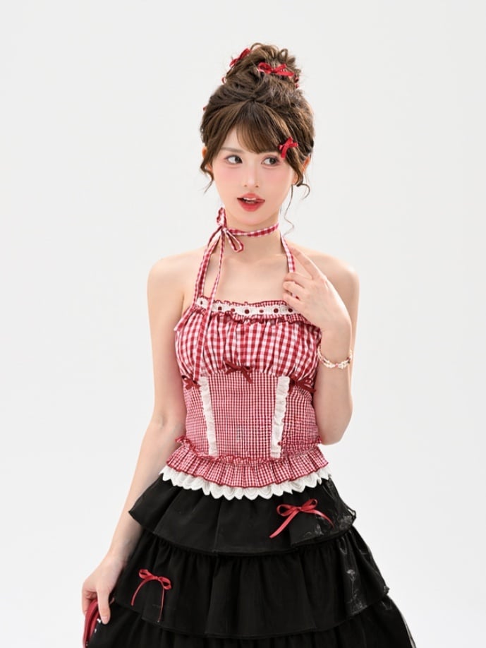 夏用レーストリム、レッドホワイトチェック柄ホルターネックトップ、ホリデー