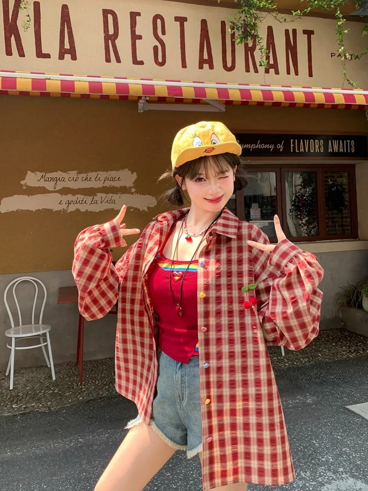 夏用ゆったりチェックシャツ(袖取り外し可能)イエロー/グリーン/レッド