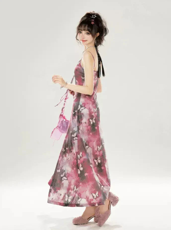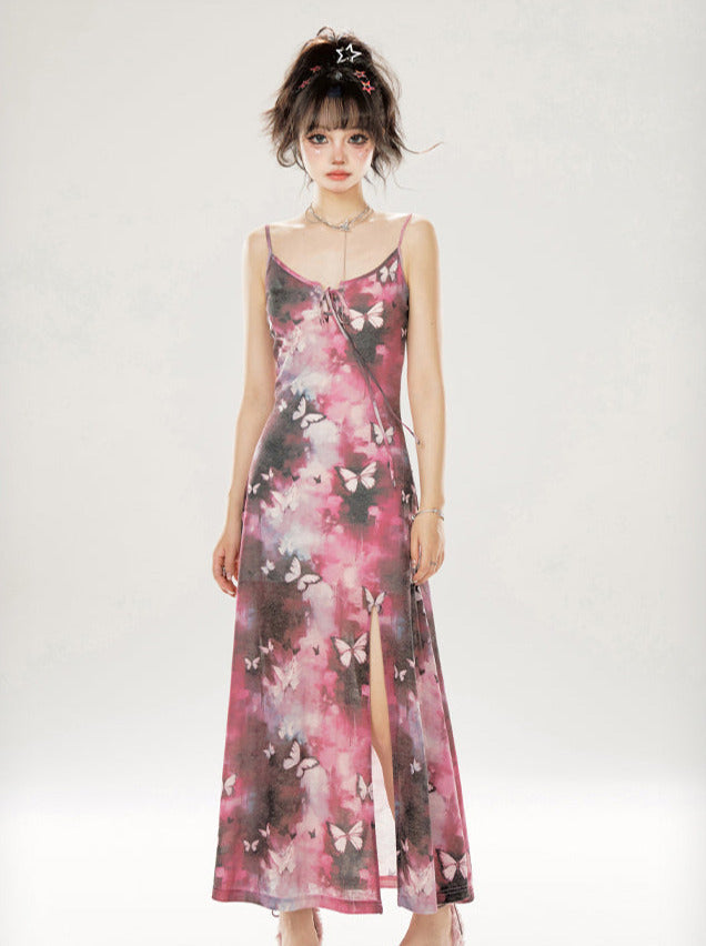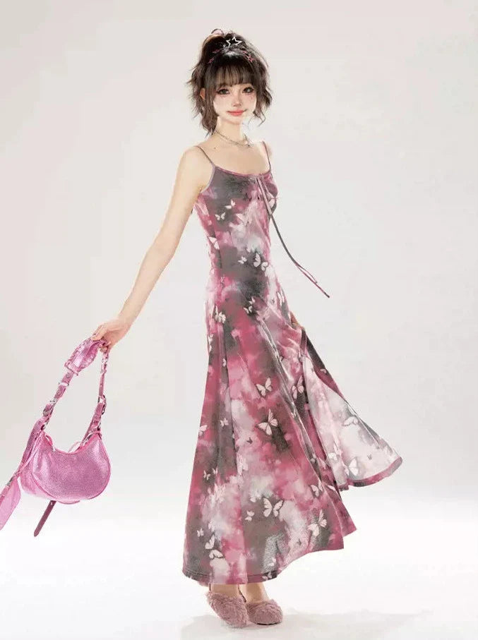 キュートな蝶のデザインと、ピンクグレーのスタイリッシュなスリットが特徴の、愛らしいサスペンダードレス。どんな装いにも華やかさを添えてくれます。