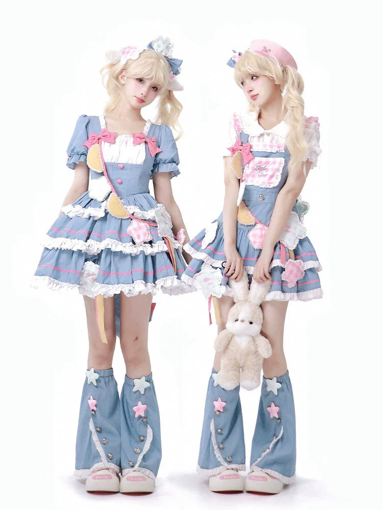青と白のオールドスクールロリータファッションドレス 蝶結びディテール JSK セット