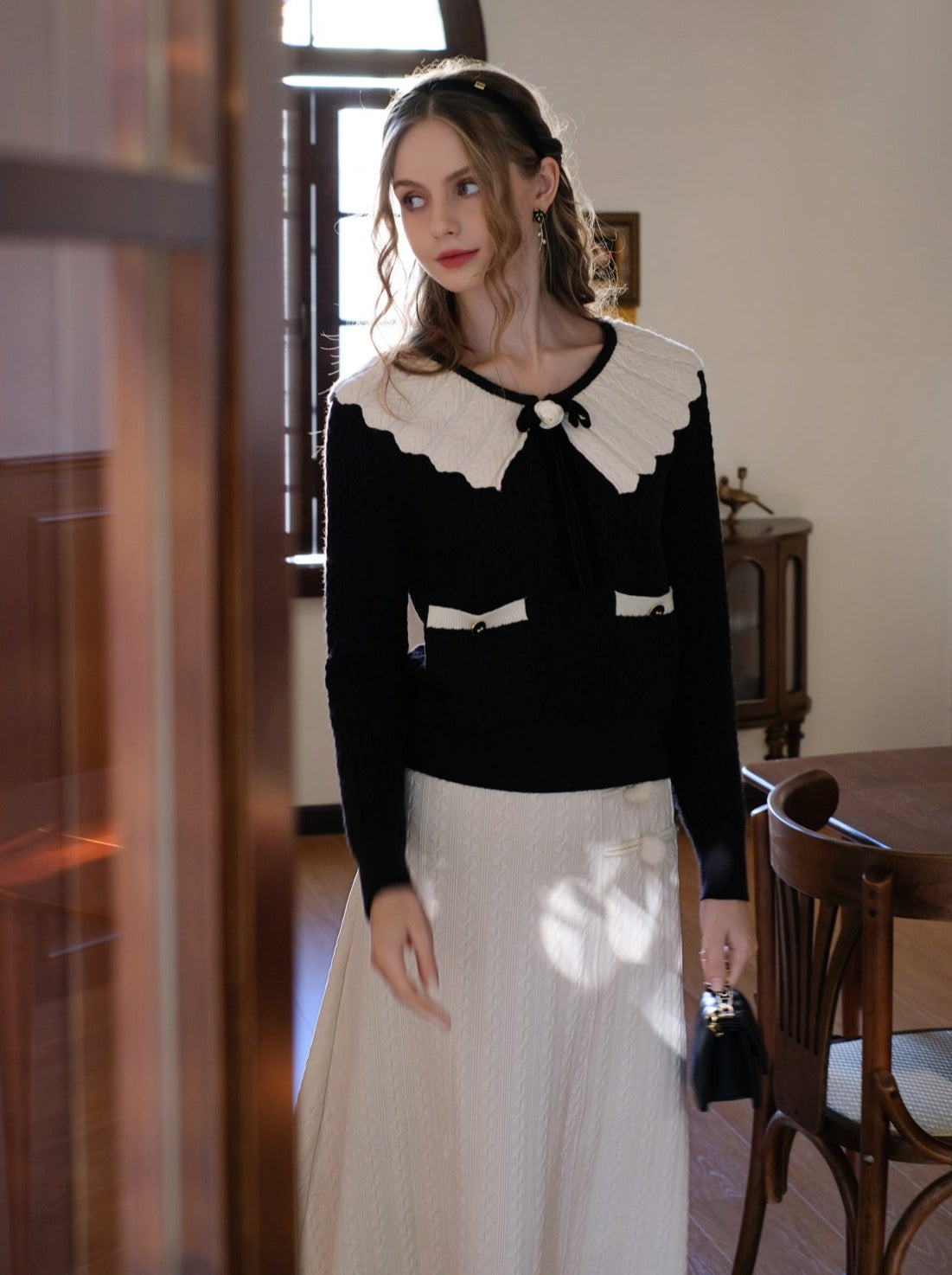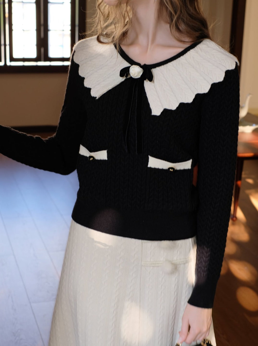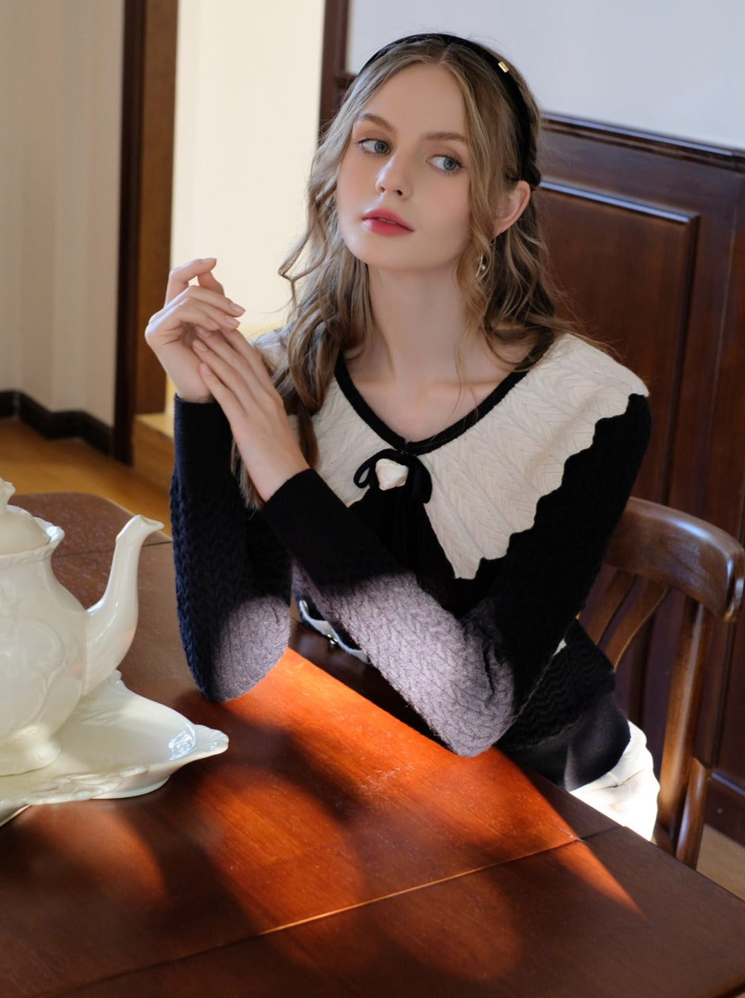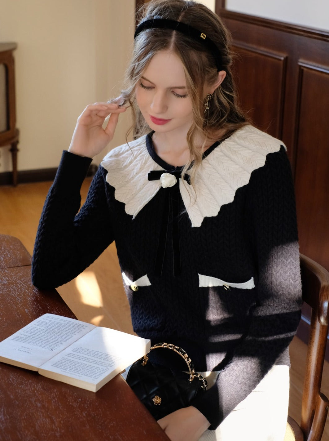 セーターブロックウェブリボンレトロラペルフレンチカラーカーディガン