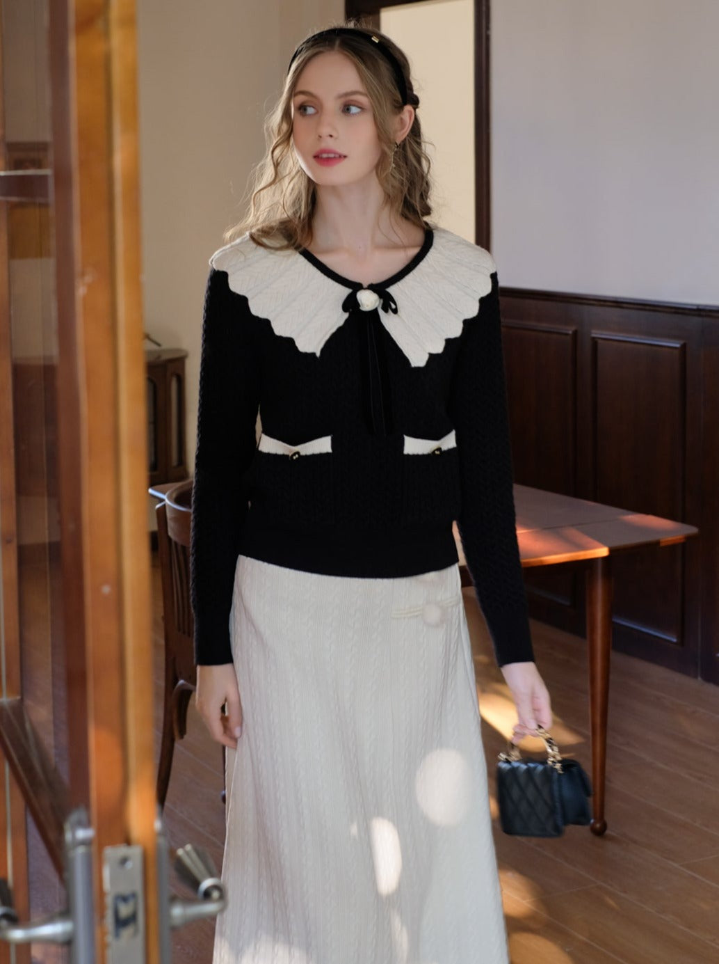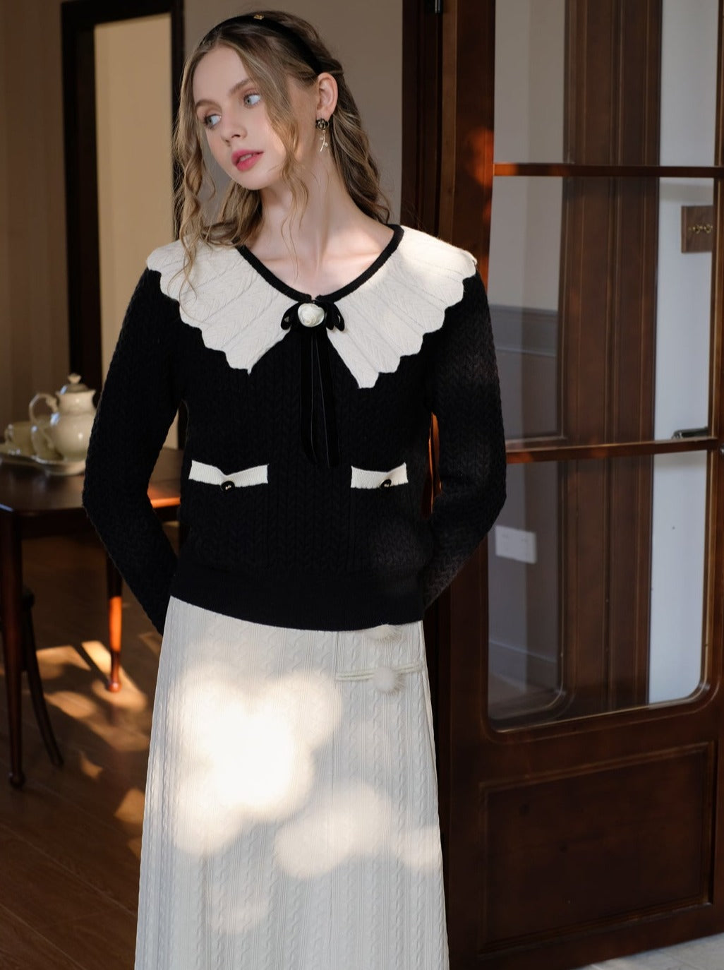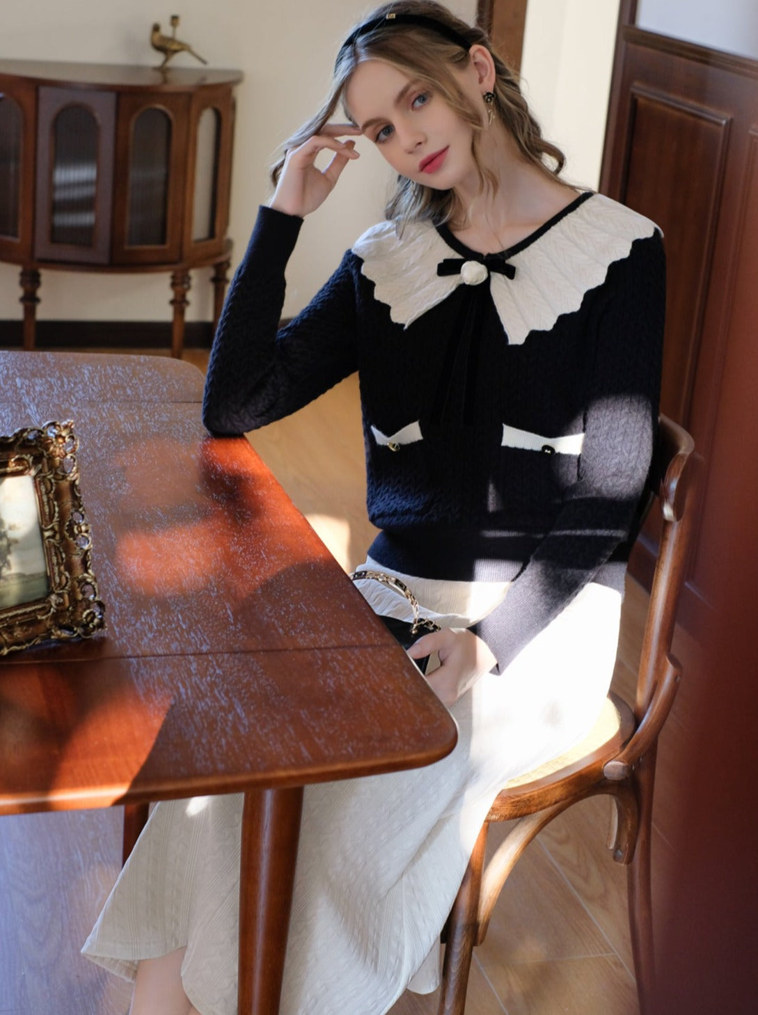 セーターブロックウェブリボンレトロラペルフレンチカラーカーディガン