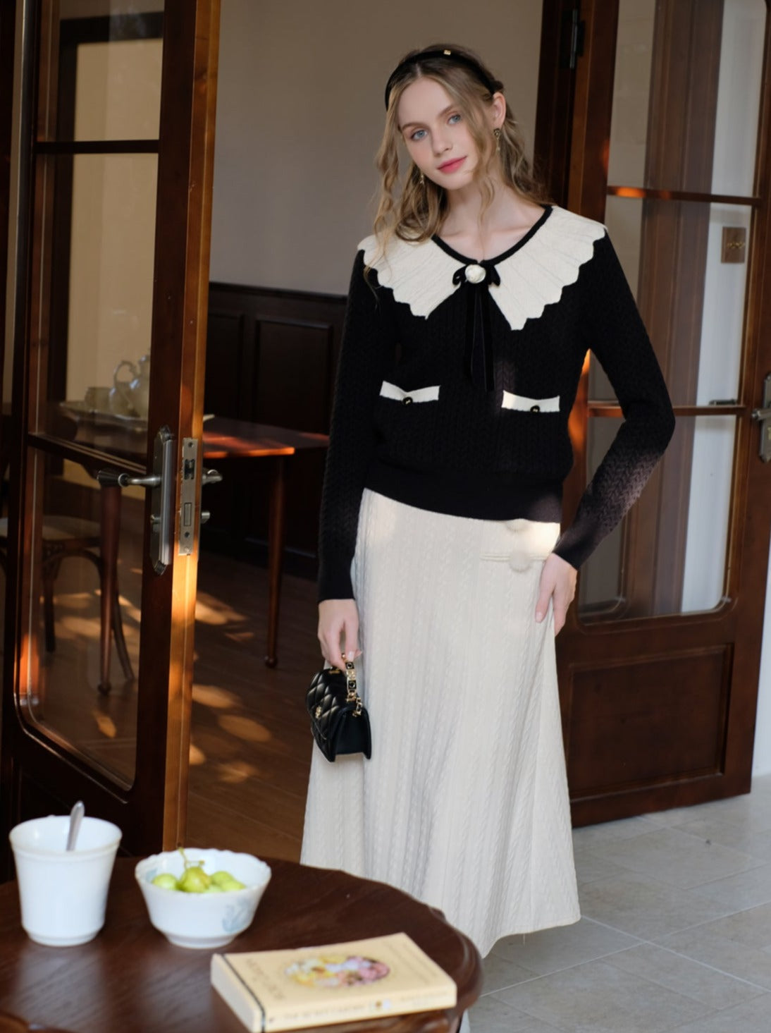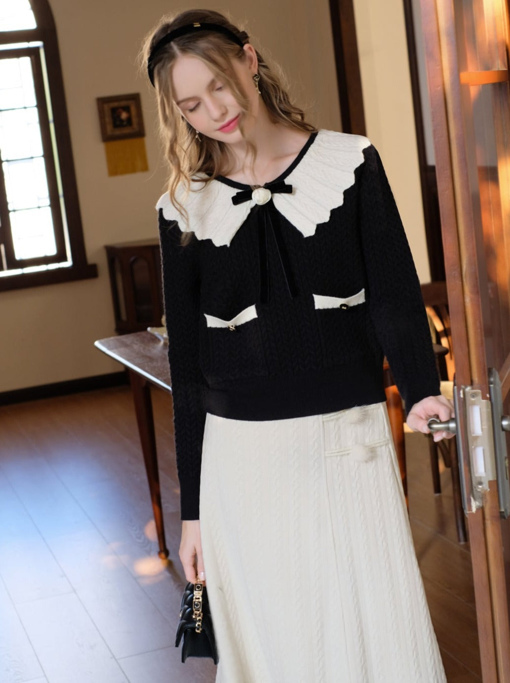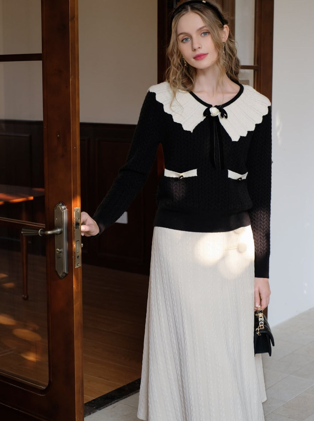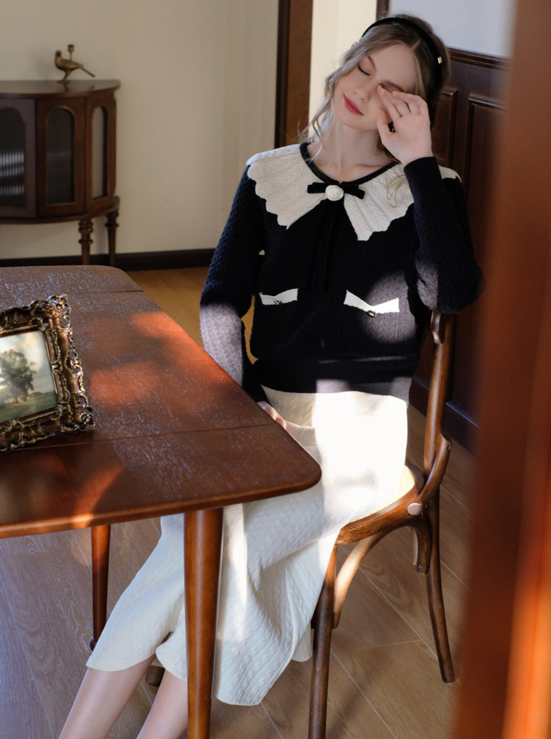 セーターブロックウェブリボンレトロラペルフレンチカラーカーディガン
