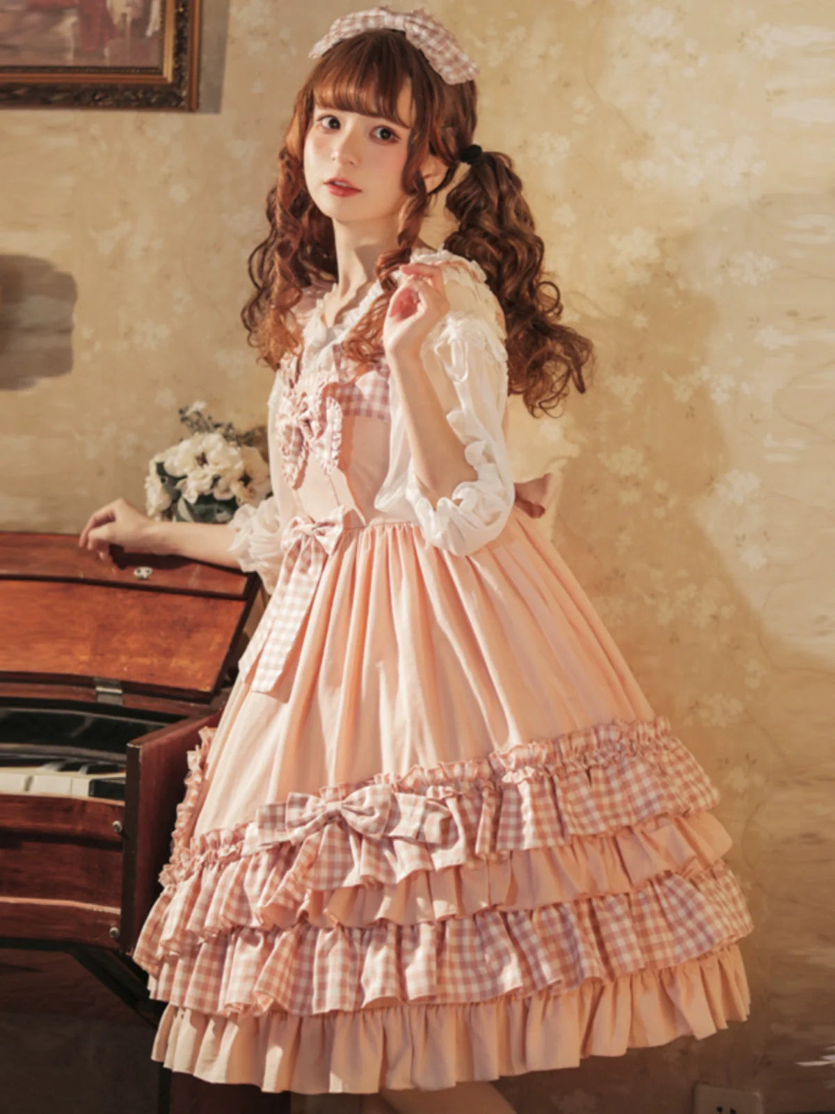 ピンクと白のオールドスクールロリータファッションドレス、蝶結びディテール、ロリータJSKセット