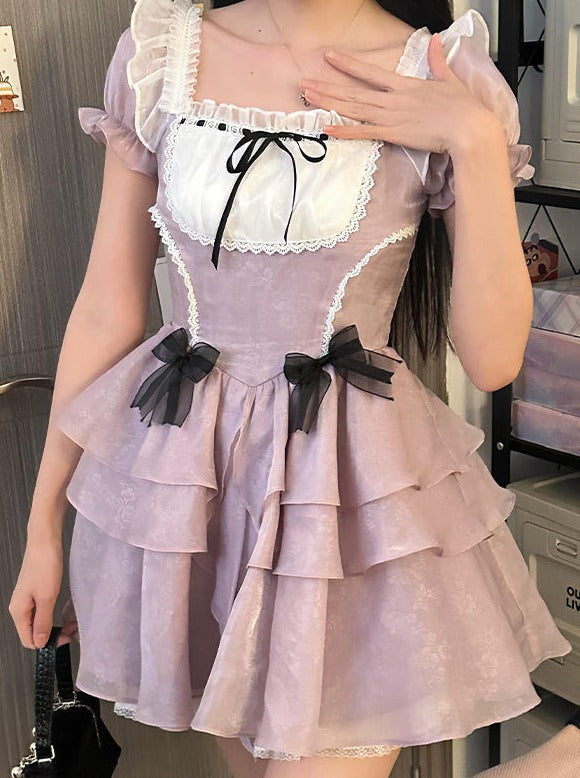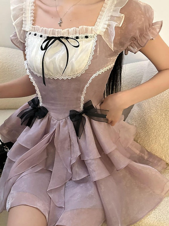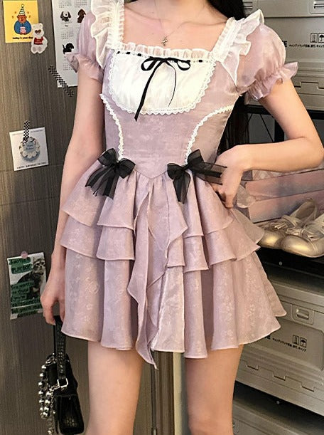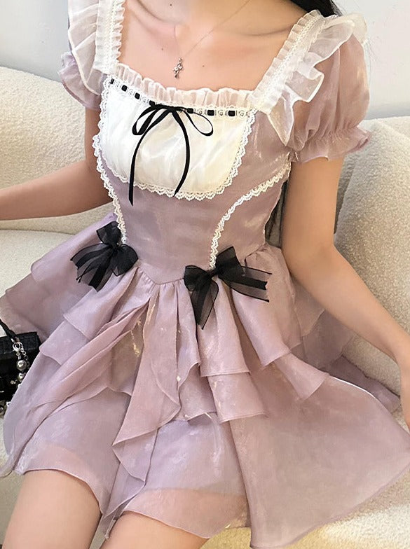 このスイートドレスは、スクエアネックとガーリーなデザインが特徴で、スタイリッシュでありながら愛らしさも兼ね備えています。デッドラインカットがシックな雰囲気をプラス。どんなシーンにもぴったりのこのドレスは、キュートでトレンド感のあるスタイルを演出します。
