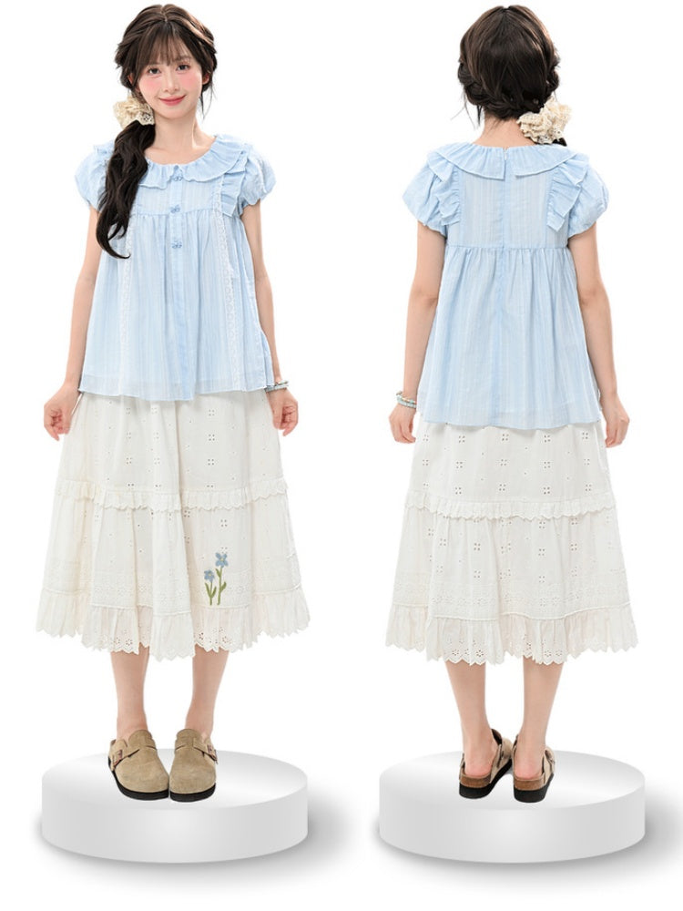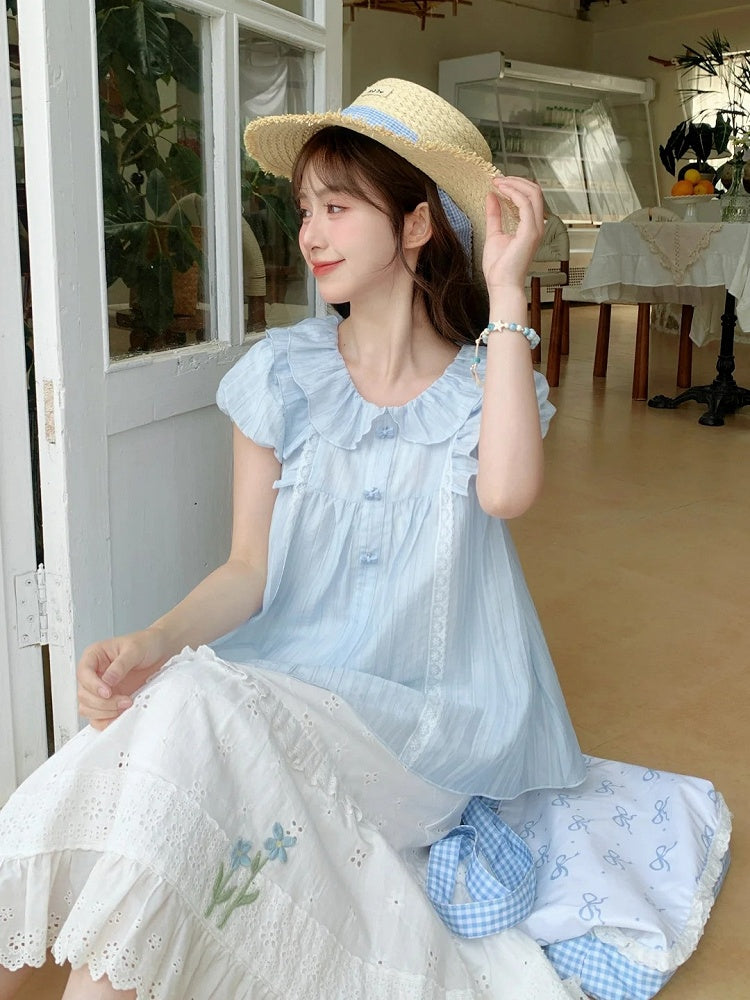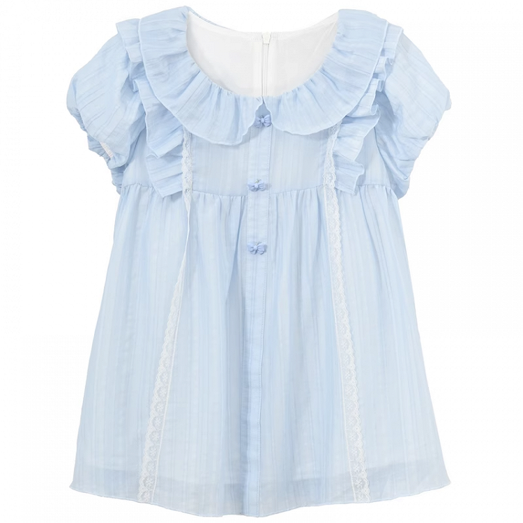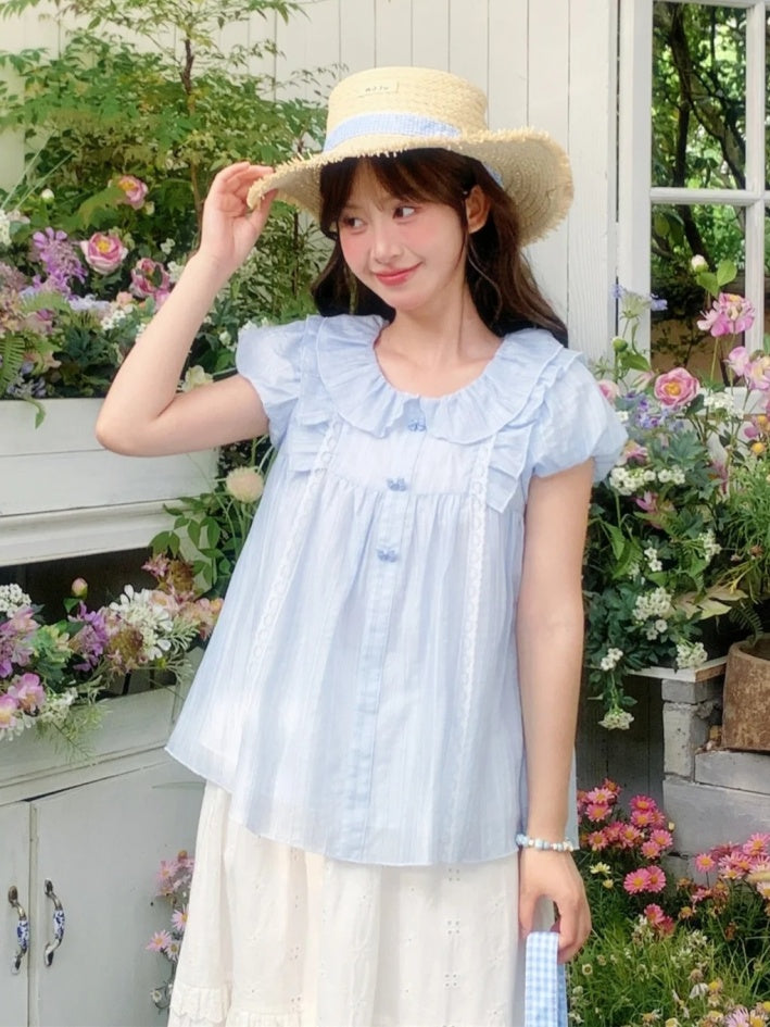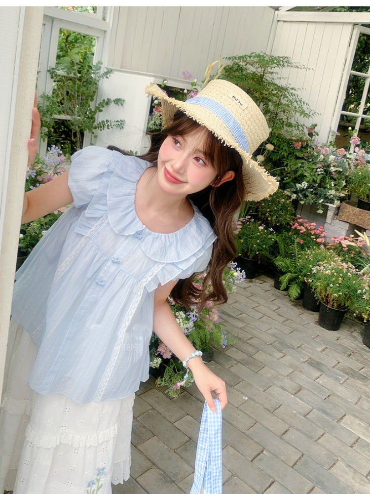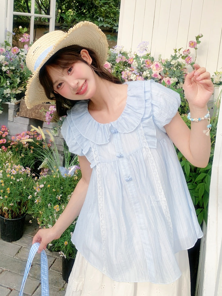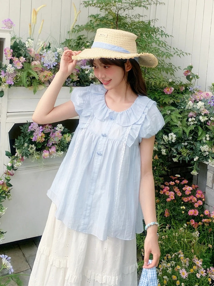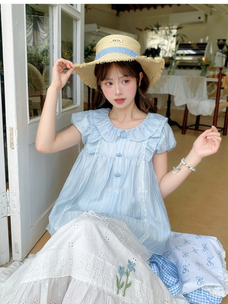 スイートライトブラウス ブルー ピーターパンカラー パフスリーブ