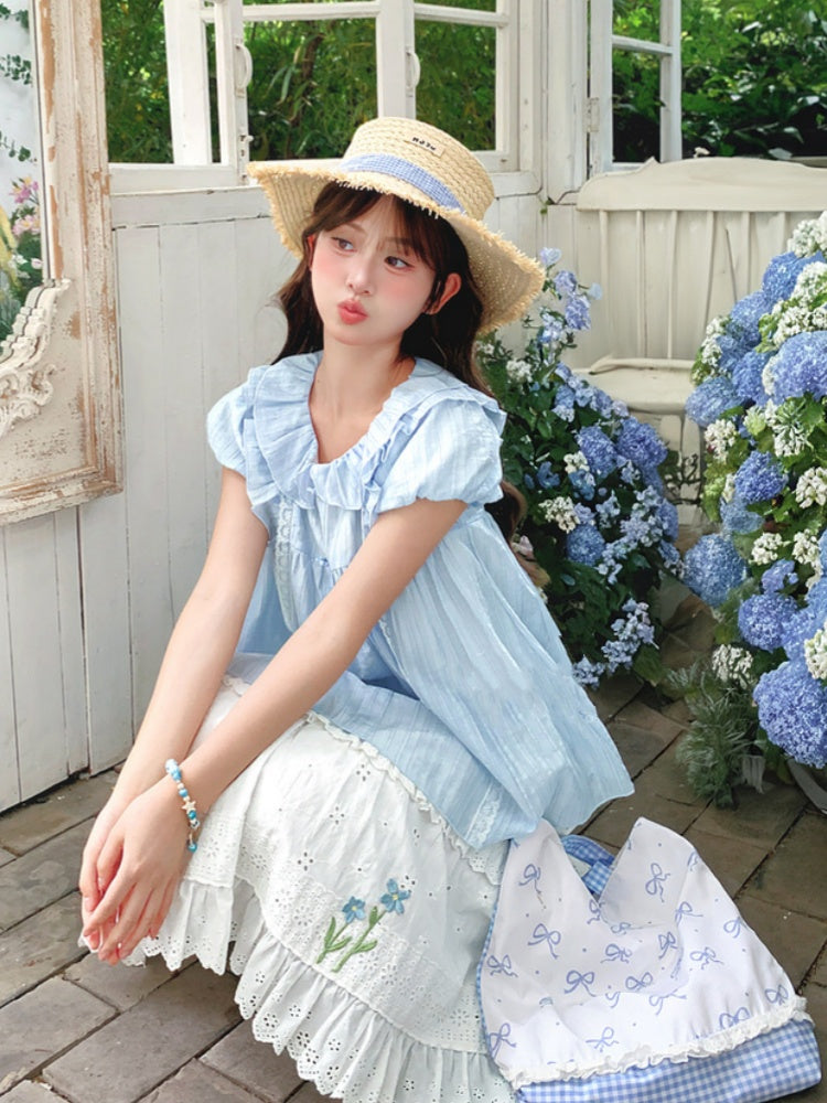 ライトブルーのピーターパンカラーのパフスリーブのスイートブラウス