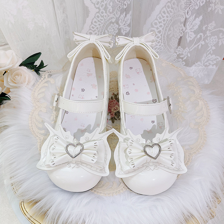 スイートロリータミルクホワイトリボンハートバックルストラップブロックヒールメリージェーン