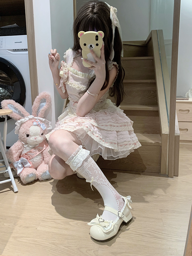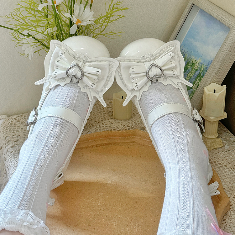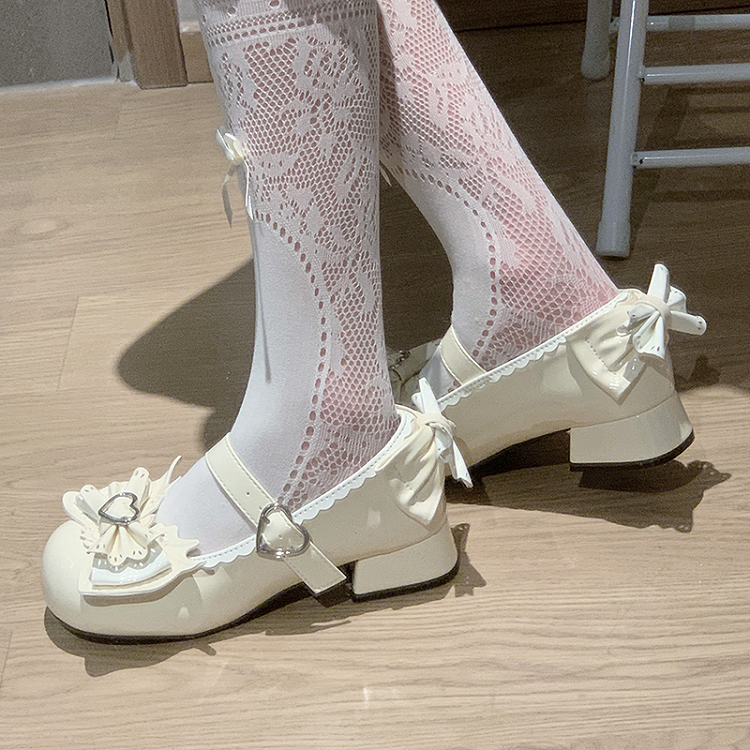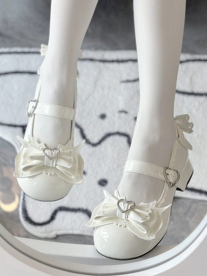スイートロリータ風ミルクホワイトのメリージェーンは、キュートなリボンとハートのバックルストラップ、そして履き心地の良いブロックヒールが特徴です。甘くて愛らしいスタイルにぴったりです。