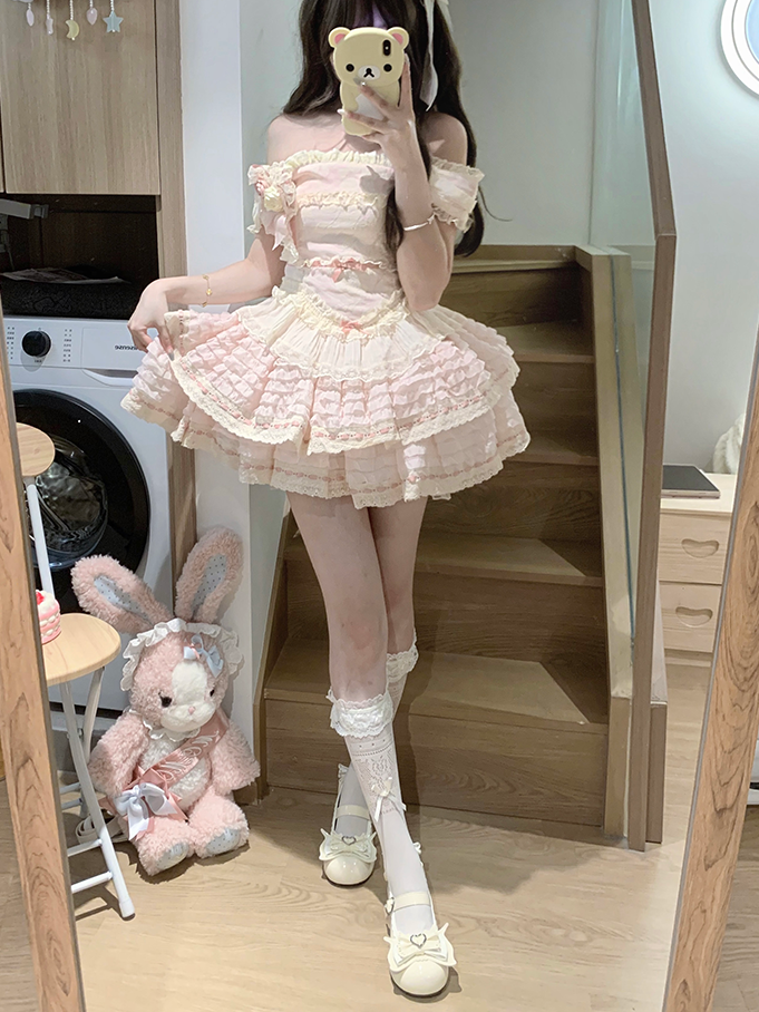 ピンクと白のオールドスクールロリータファッションドレス、蝶結びディテール、ロリータJSKセット