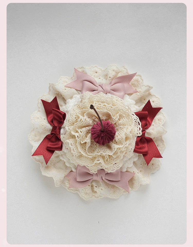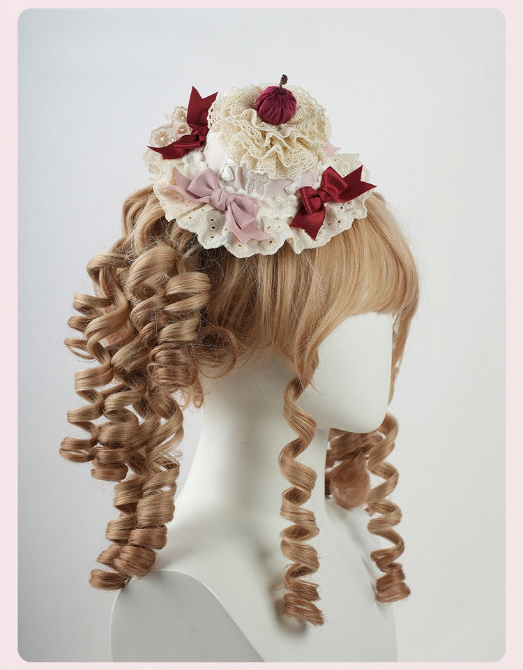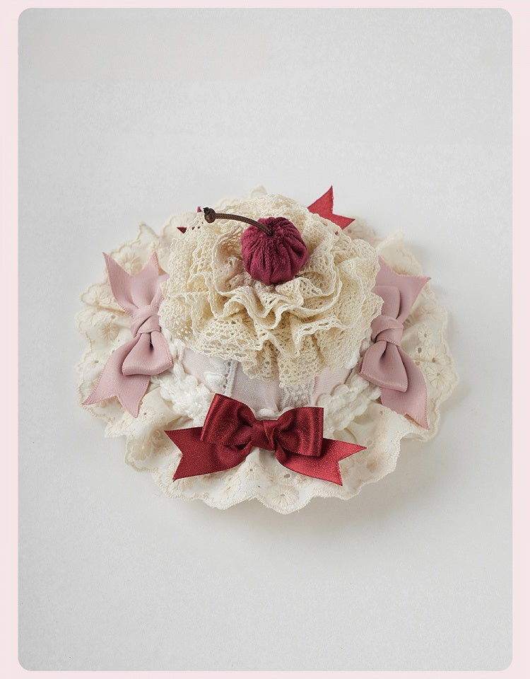 スイートロリータピンクのリボンとチェリーケーキのレイヤードレーストリムのミニハット
