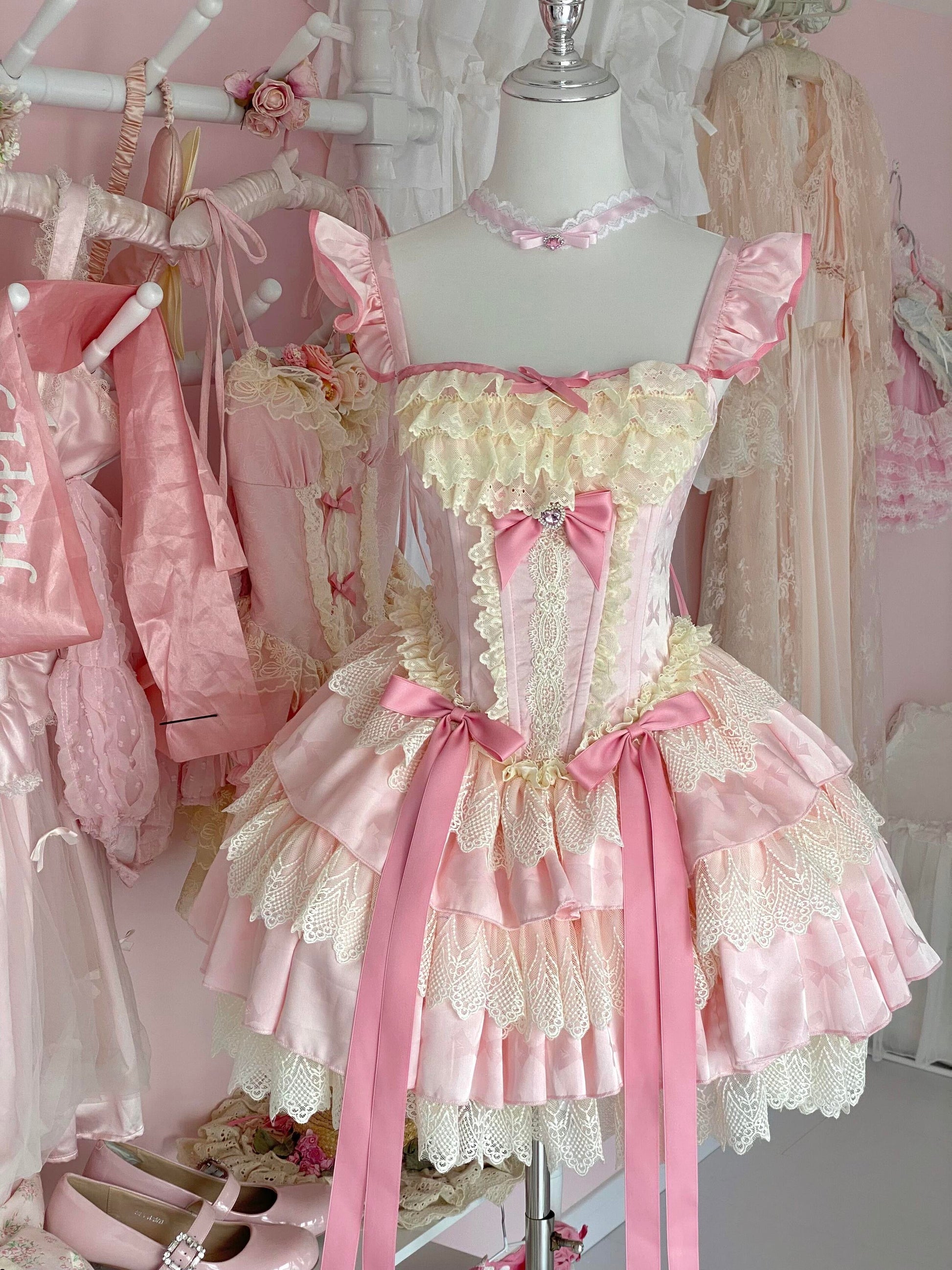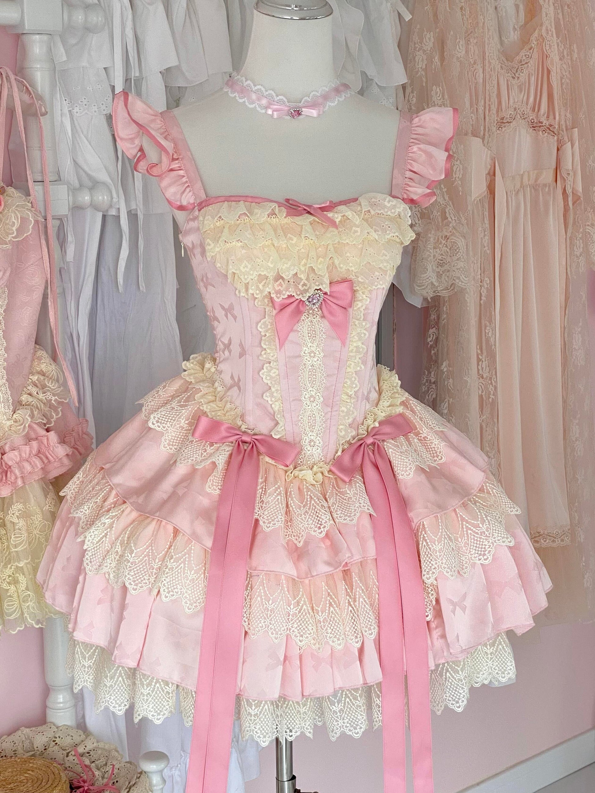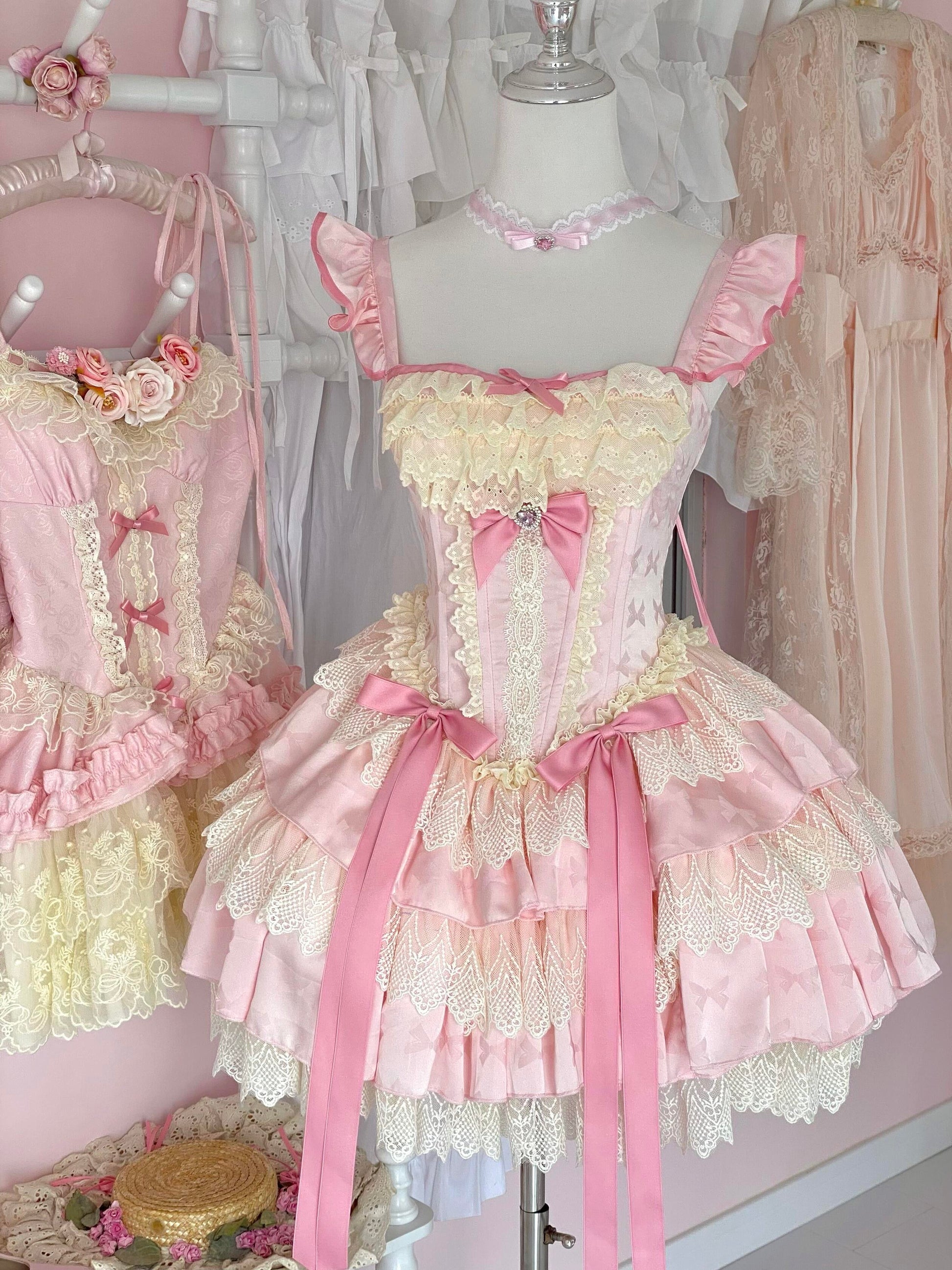 ピンクと白のオールドスクールロリータファッションドレス、蝶結びディテール、ロリータJSKセット
