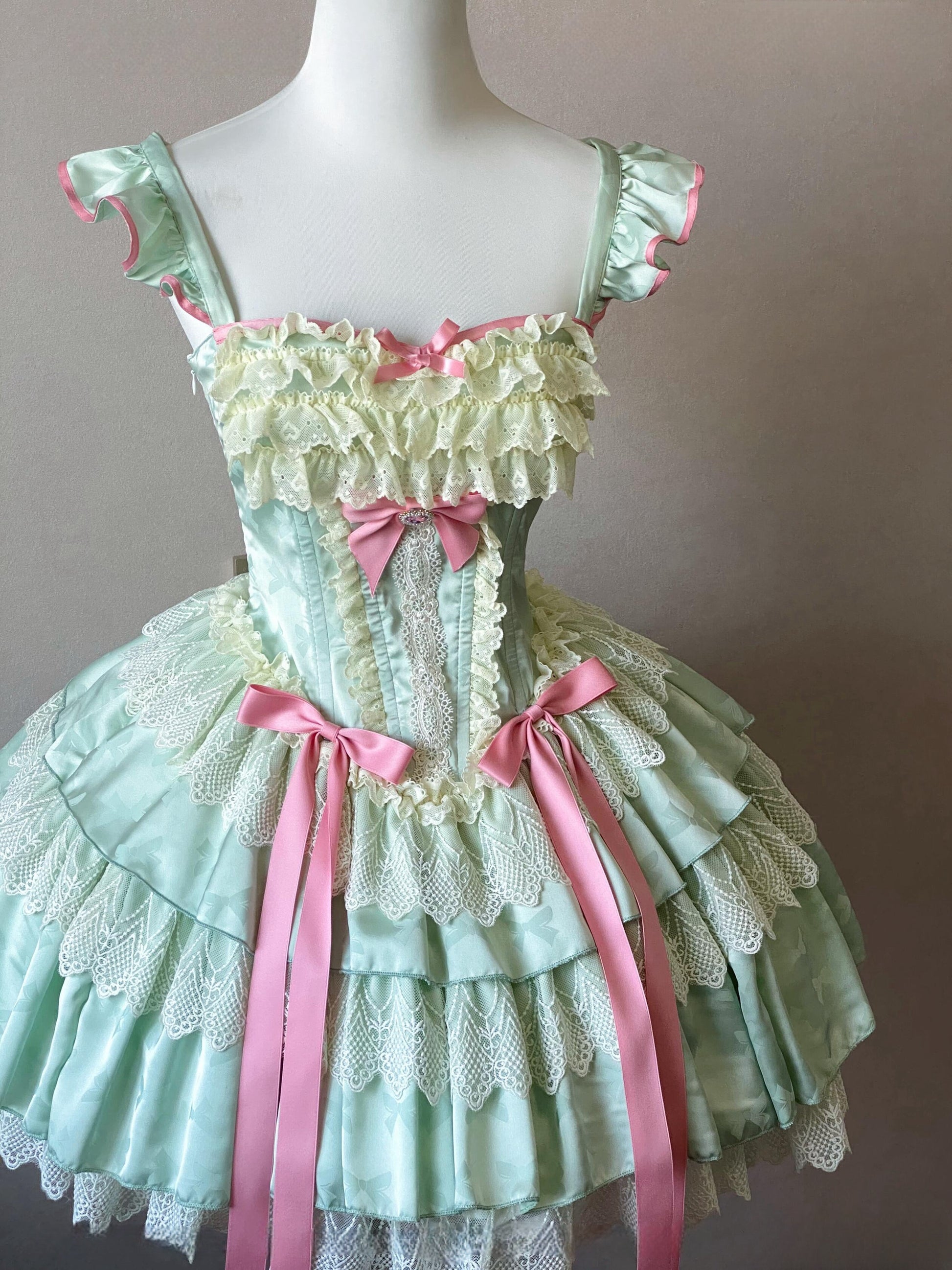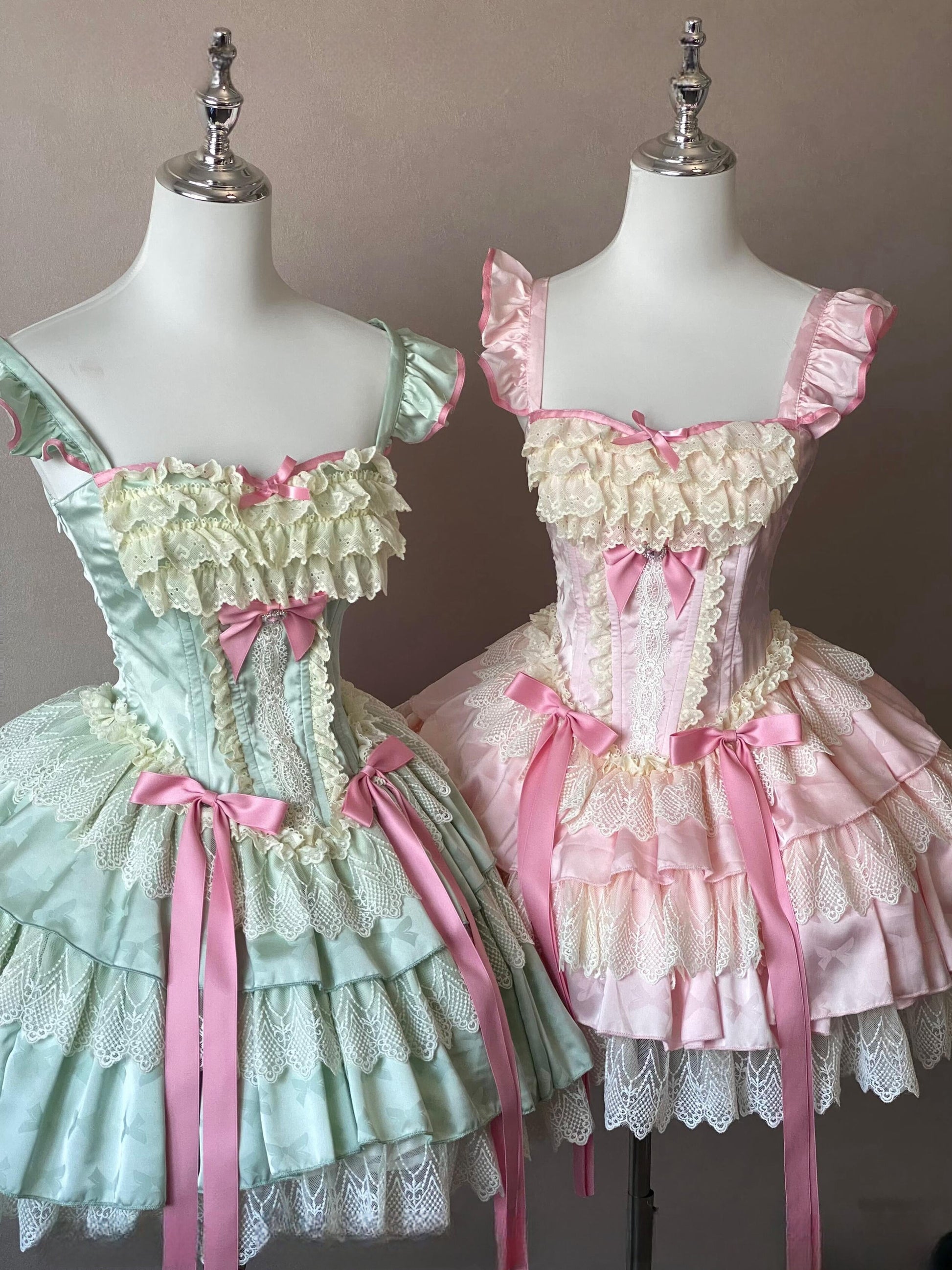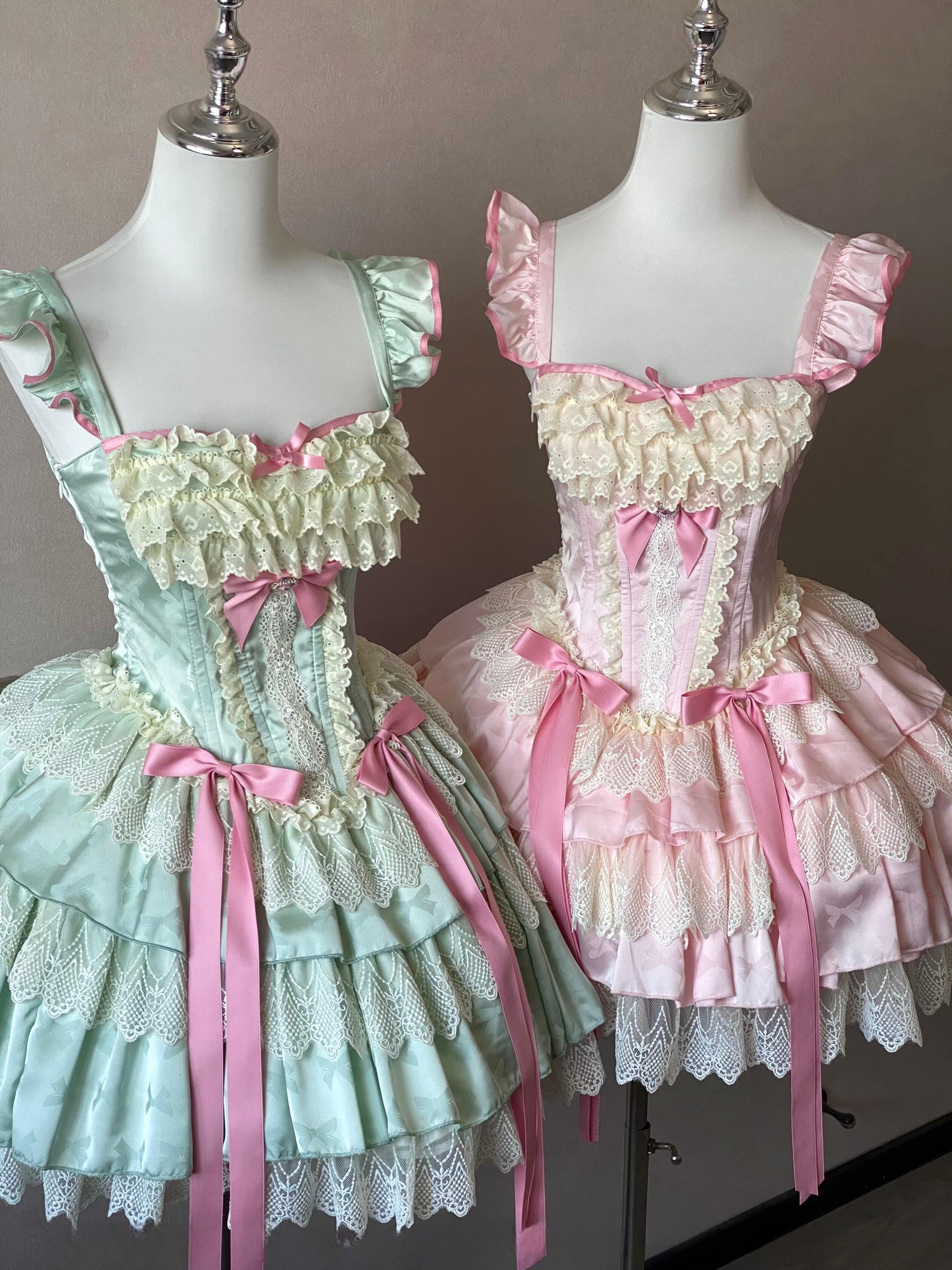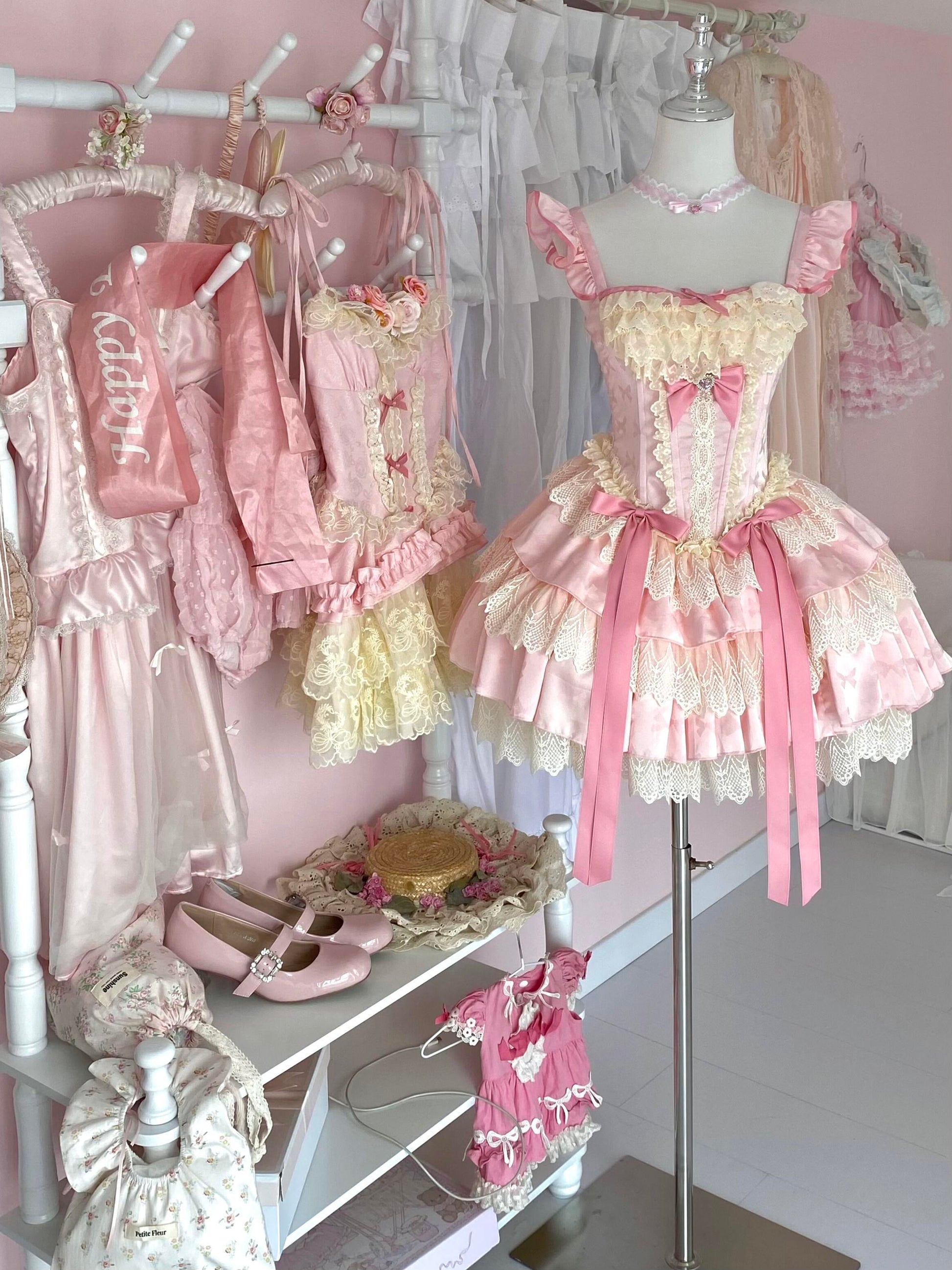 ピンクと白のオールドスクールロリータファッションドレス、蝶結びディテール、ロリータJSKセット