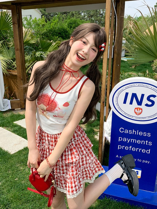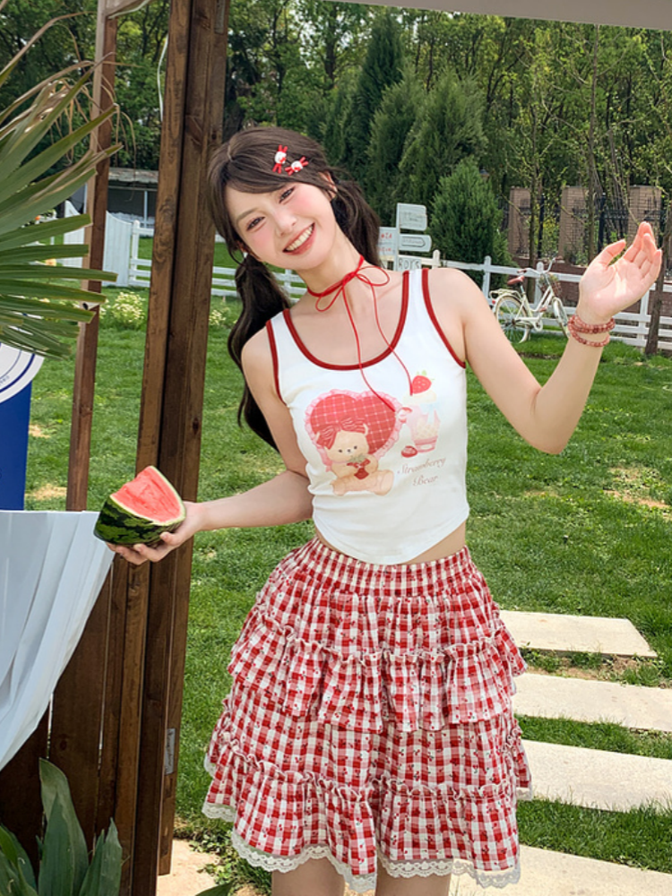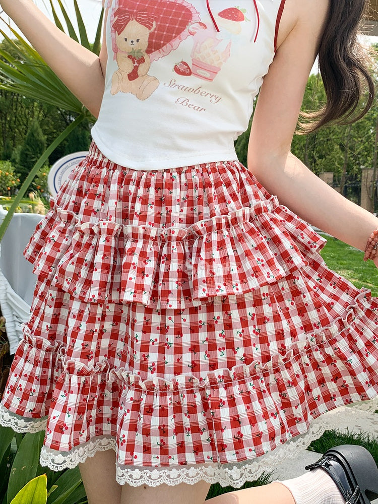 スイートレッドのチェリープリント レーストリム チェック柄 ティアードスカート