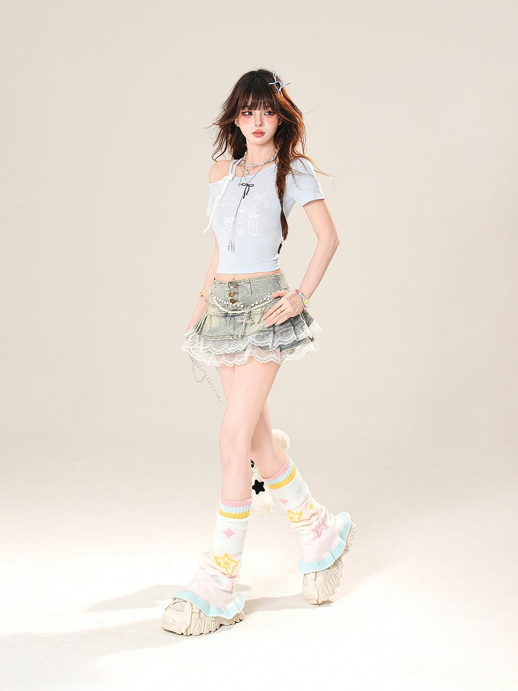 Blue Asymmetrical Neckline T-Shirt with Letter Print