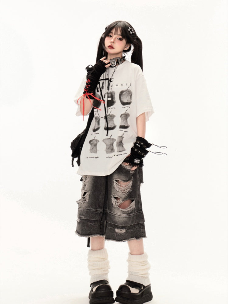 ホワイトラウンドネックアップルプリントルーズTシャツ