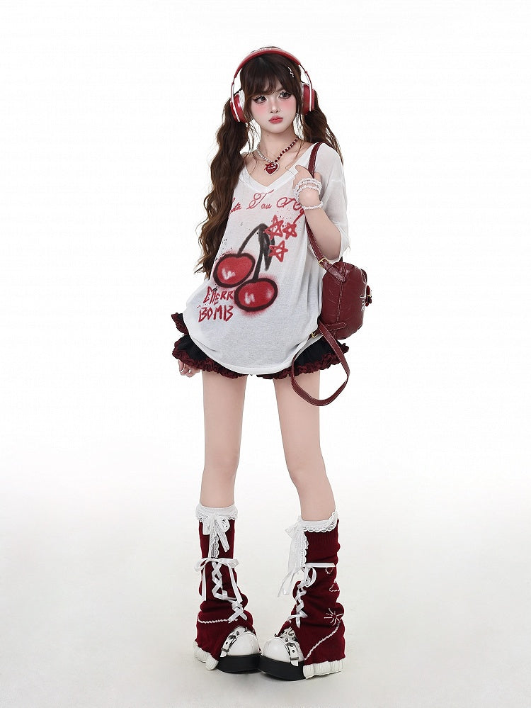 ホワイト セミシアー Vネック チェリープリント 日焼け防止 ビタースイート Tシャツ