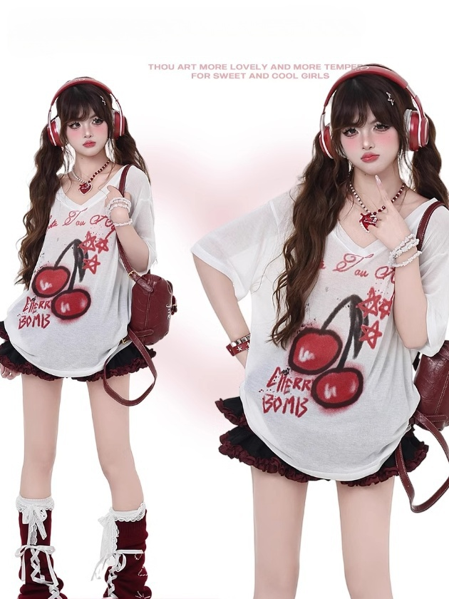 Tシャツ ホワイト セミシアー Vネック チェリープリント 日焼け防止 ビタースウィート