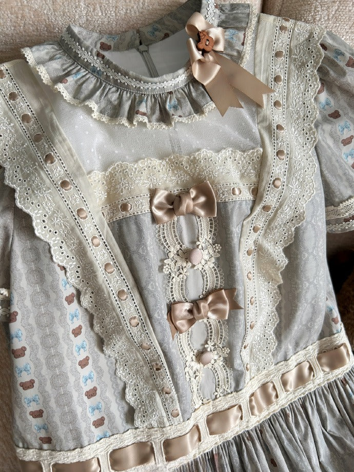 Green Bear Theme Ruffle Neckline Dropped Waist Sweet Lolita Dress