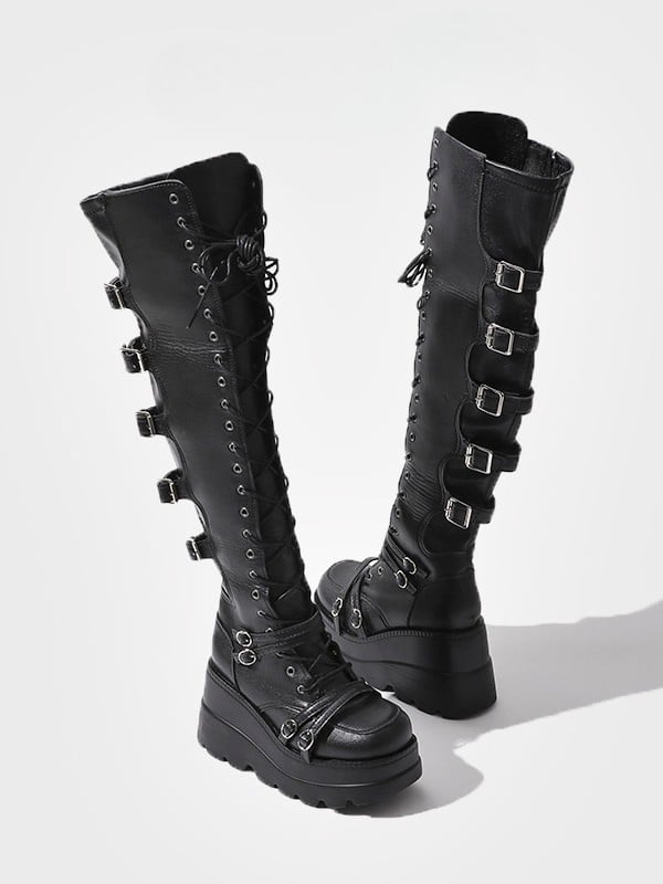Black Punk Thigh-high Platform Boots - Lace-up Closure, Buckles at Back & Inner Zip Closure
