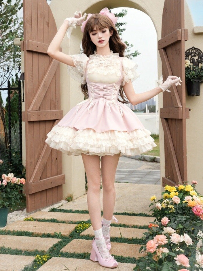ピンクと白のオールドスクールロリータファッションドレス、蝶結びディテール、ロリータJSKセット