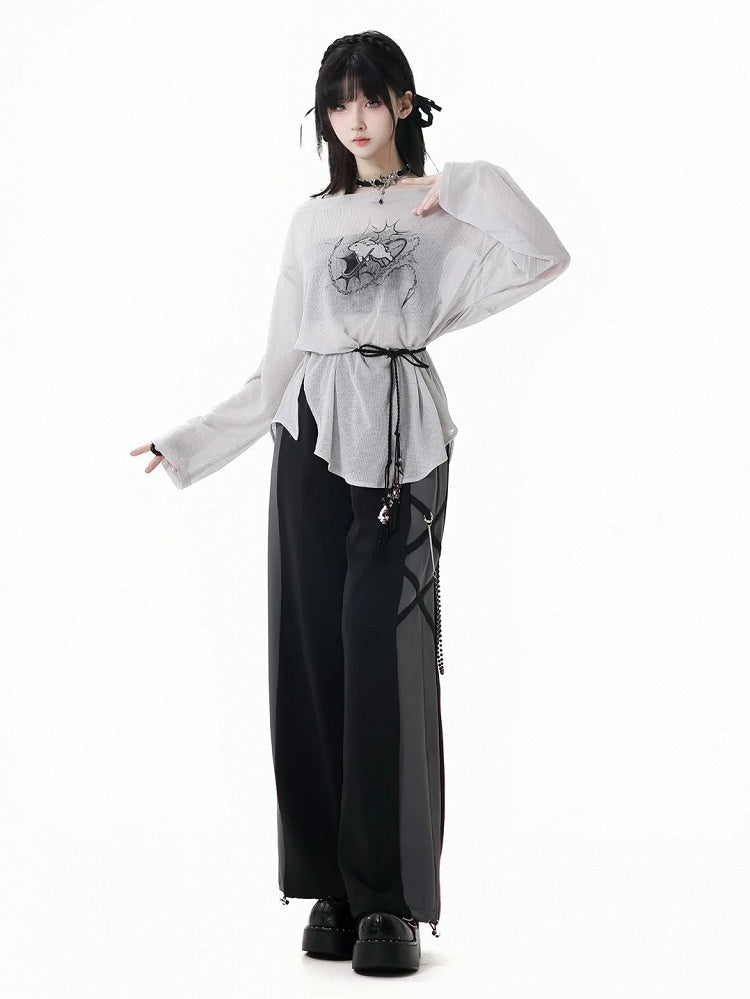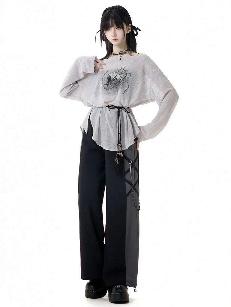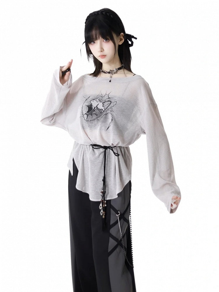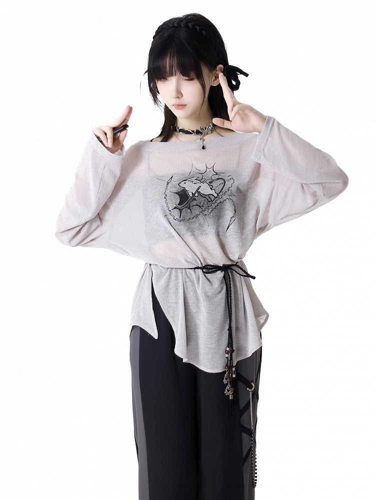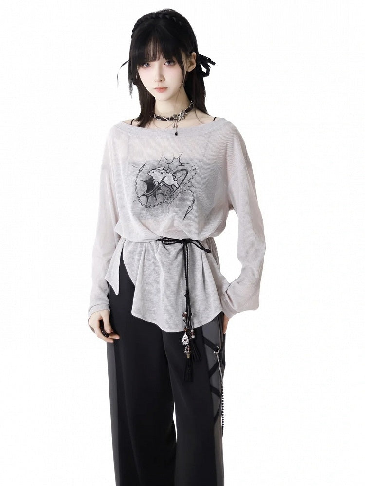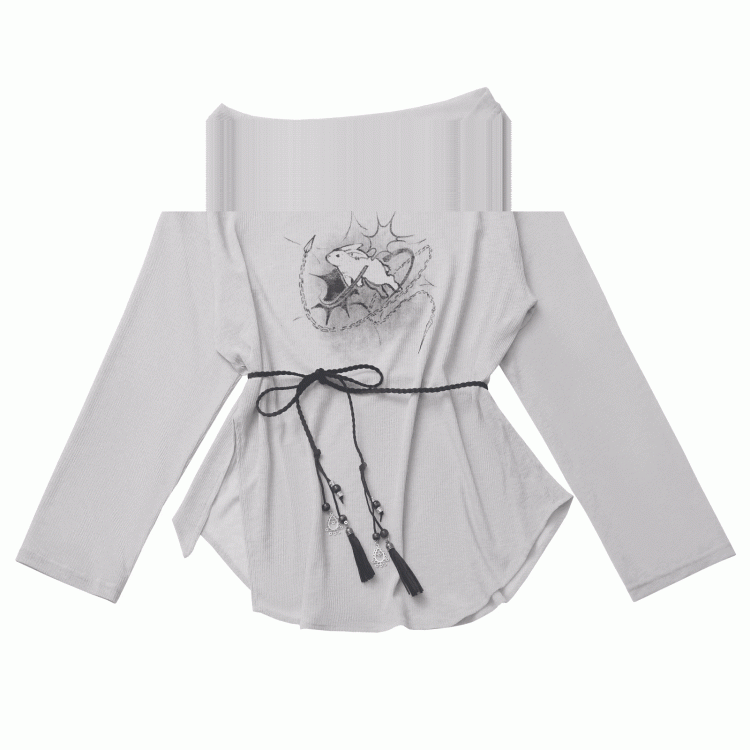 グレーのオフショルダーバニープリントカバーアップ+キャミトップ+セルフタイストラップの3点セット