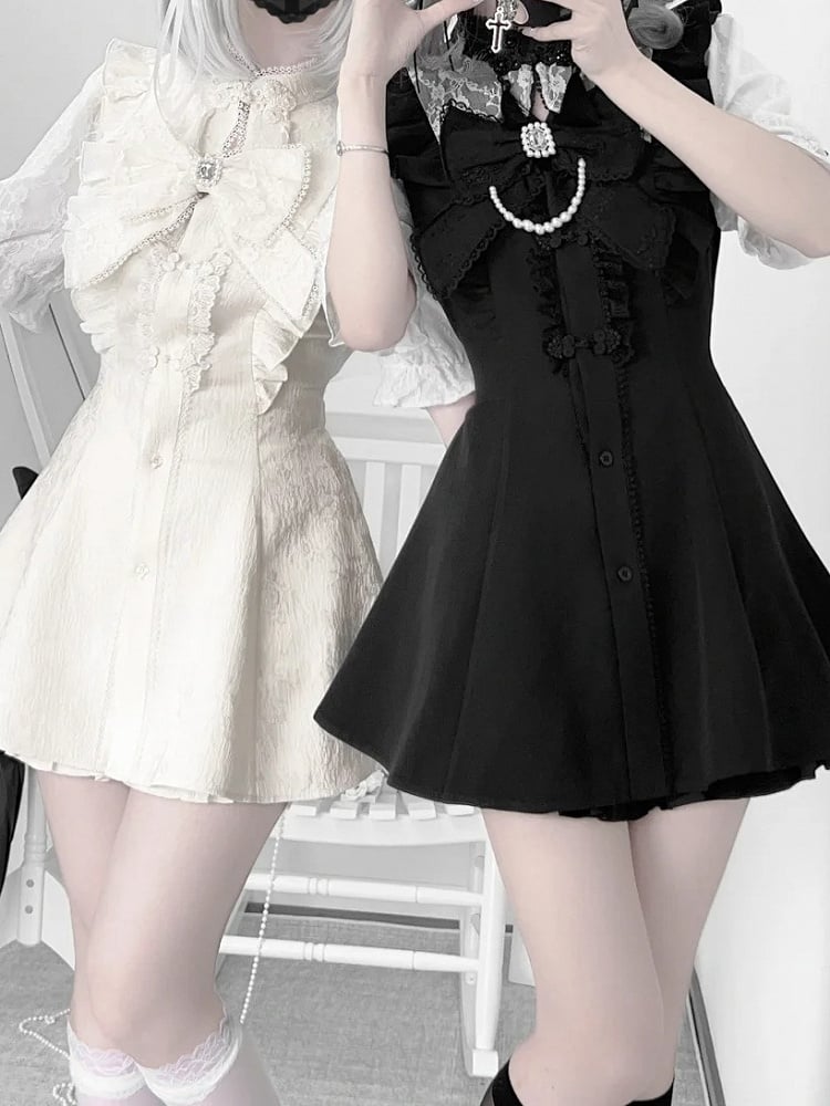 Y2K ホワイトジライケイセット-チャイナドレス+ショートパンツ+蝶ネクタイ+ヘアクリップ