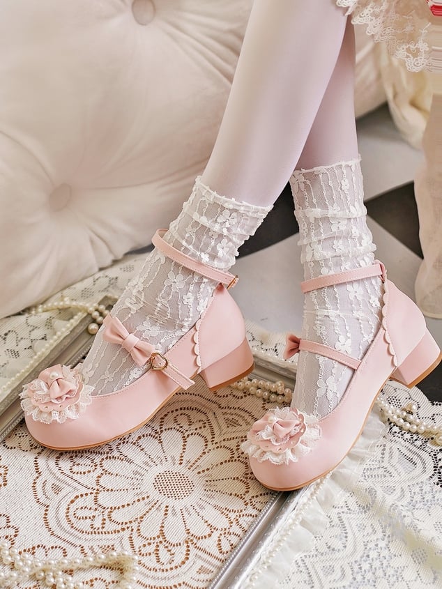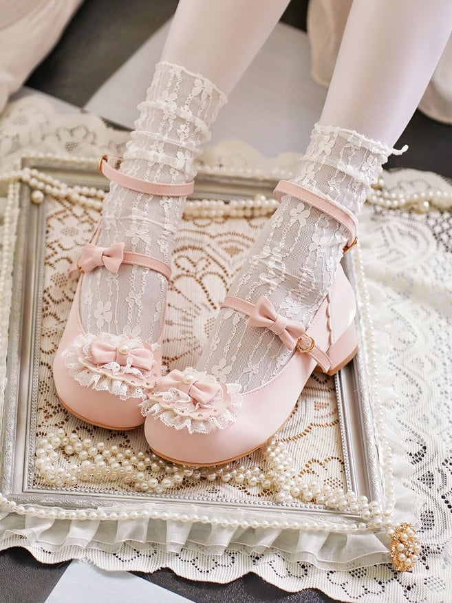 トップにベビーピンクのリボン、レーストリム、ハートバックル、ラウンドトゥのロリータシューズ