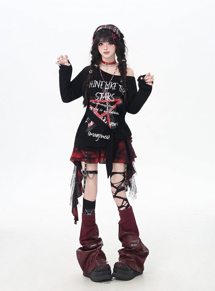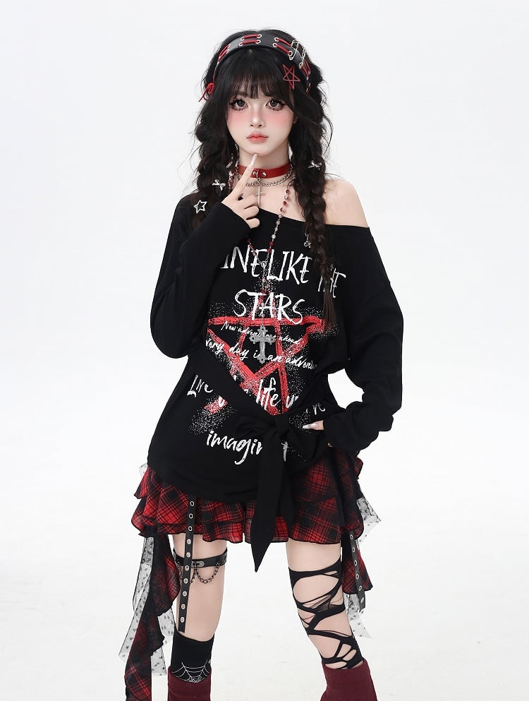 トップス ブラック アシンメトリーネックライン スター グラフィティプリント ルーズ