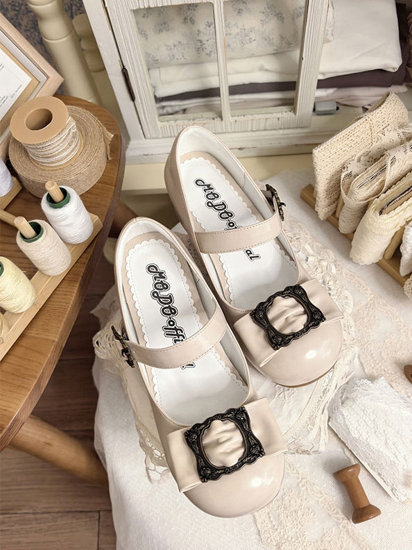 PU Elegant Classic Lolita Beige Mary Janes - Bow at Top & Picture Frame Design