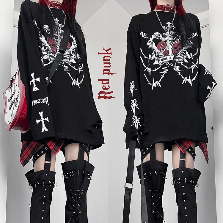 ブラック エモ パンク クロス&レタープリント ロングスリーブ トップス