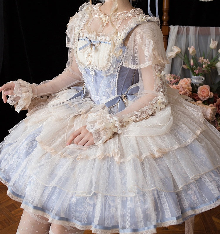 青と白のオールドスクールロリータファッションドレス 蝶結びディテール JSK セット