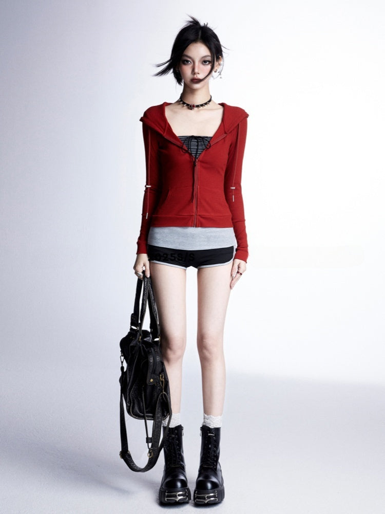 ブラック/グレー/レッド ジップ開閉 スリムフィット フード付きトップス