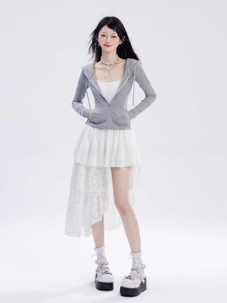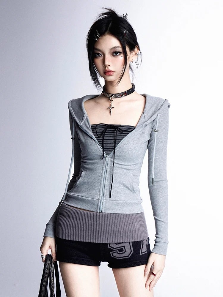 トップス スリムフィット フード付き ジップ開閉 ブラック/グレー/レッド