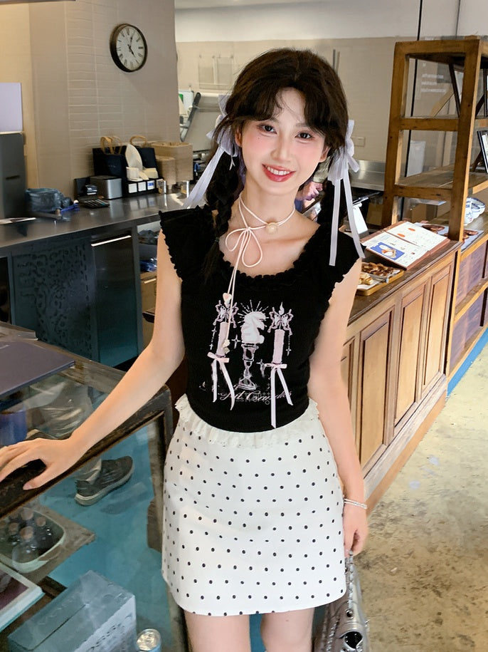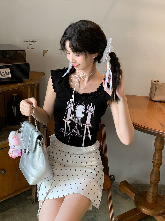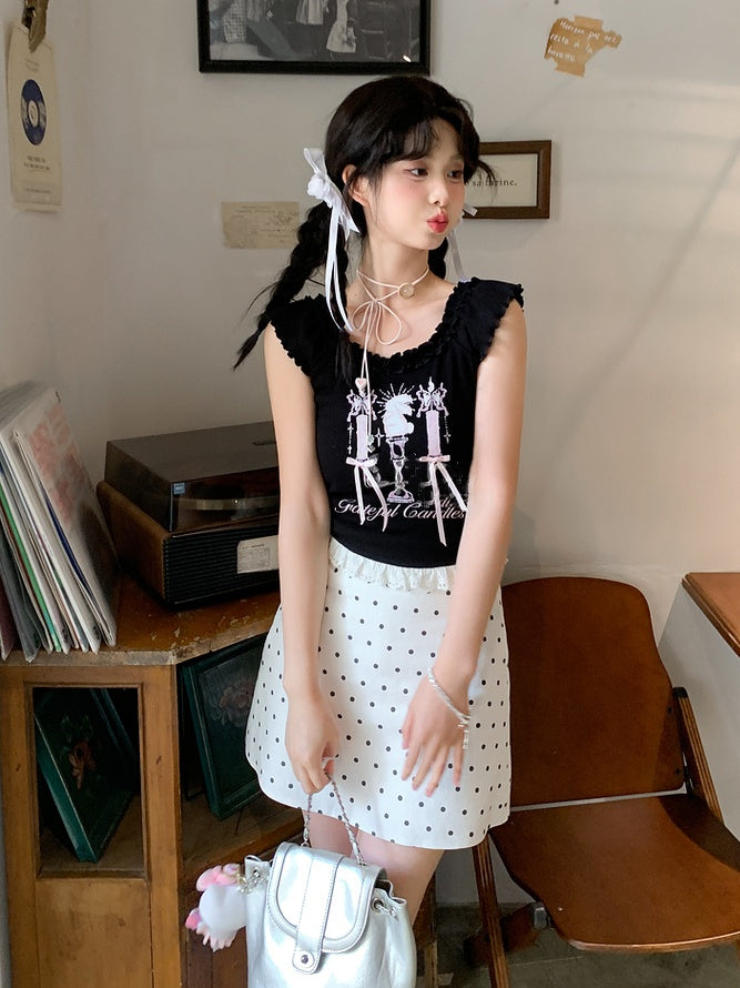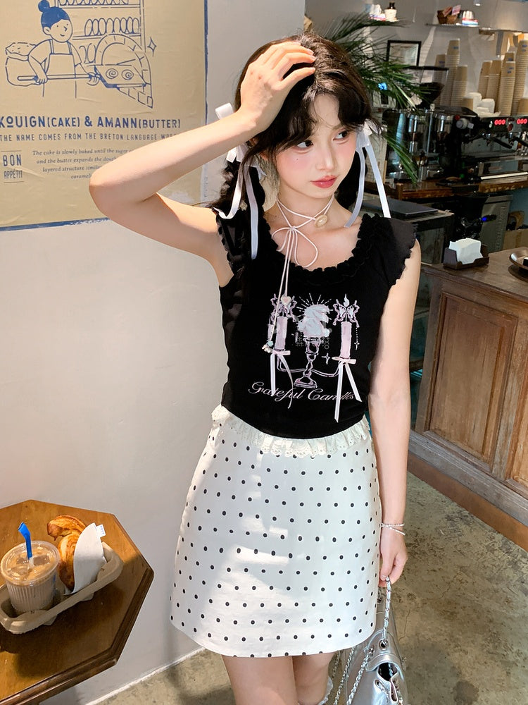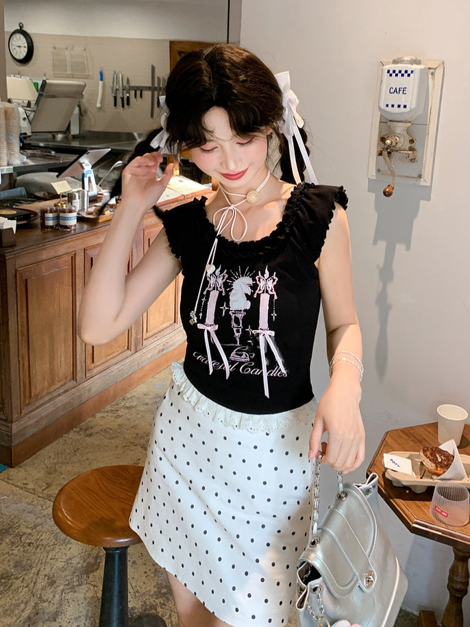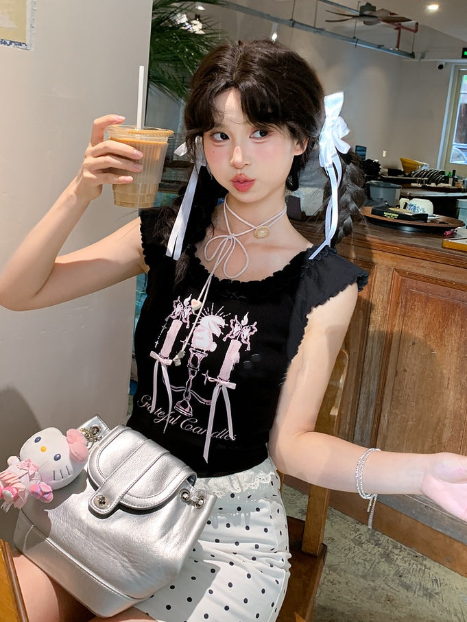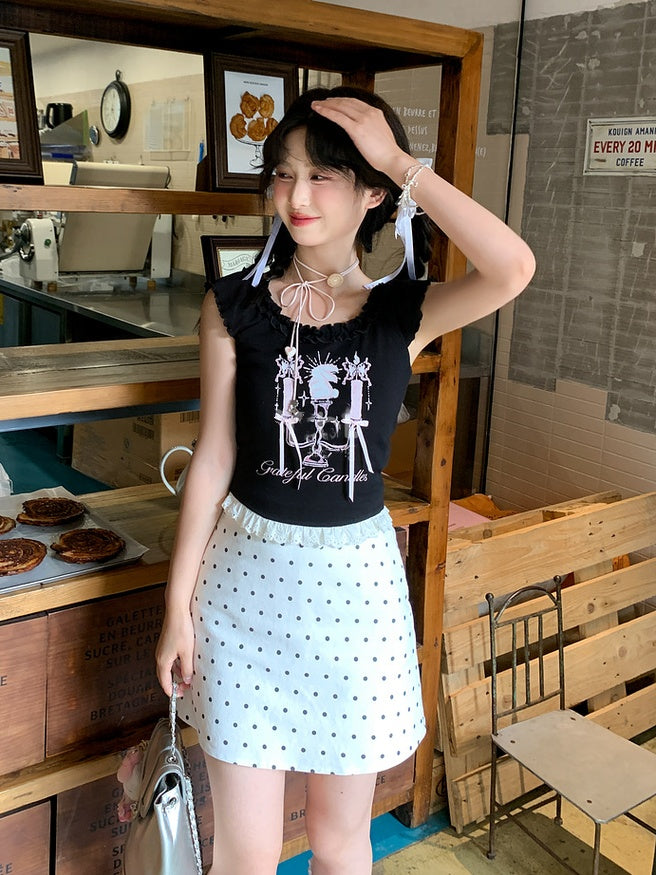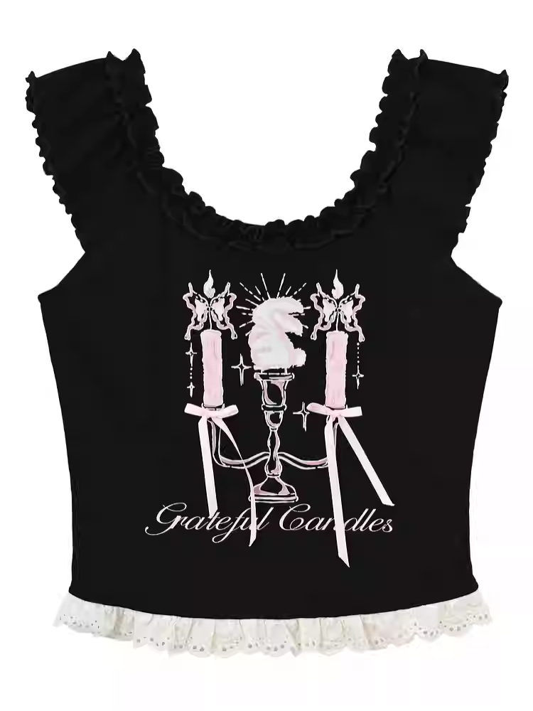 ブラックキャンドルスティックプリントレーストリムビタースウィートタンクトップ