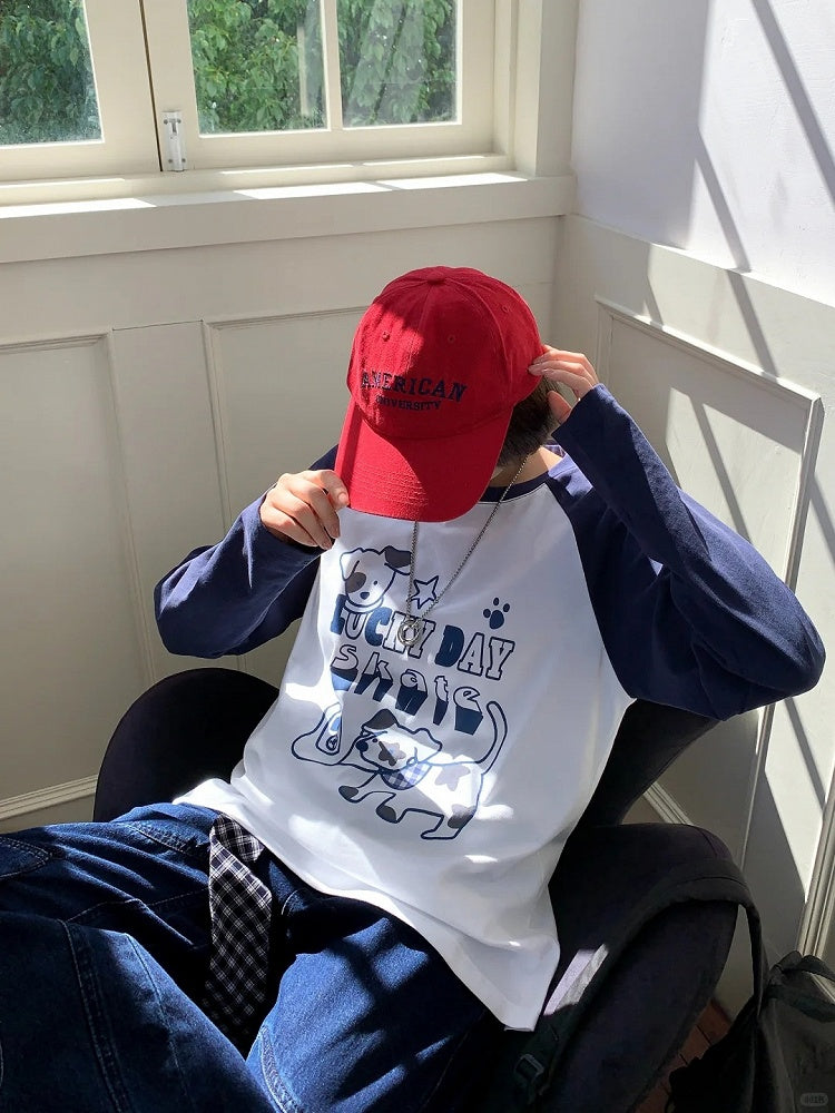 ホワイト/ブルーのカラーブロックデザイン、愛らしい子犬プリントのルーズトップ